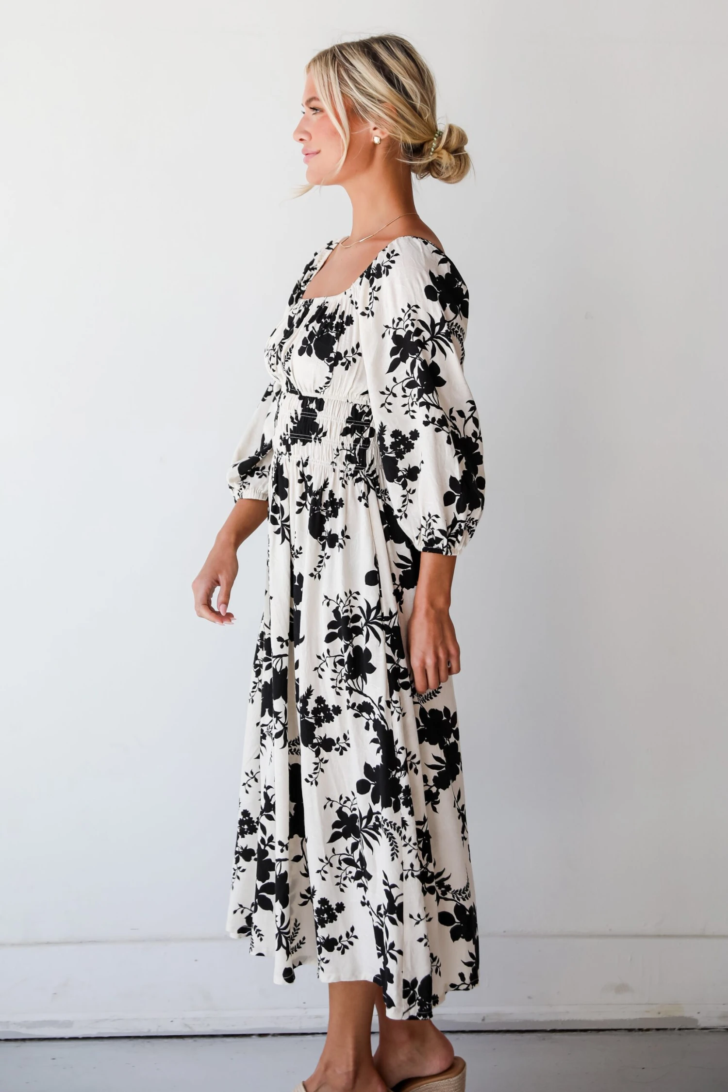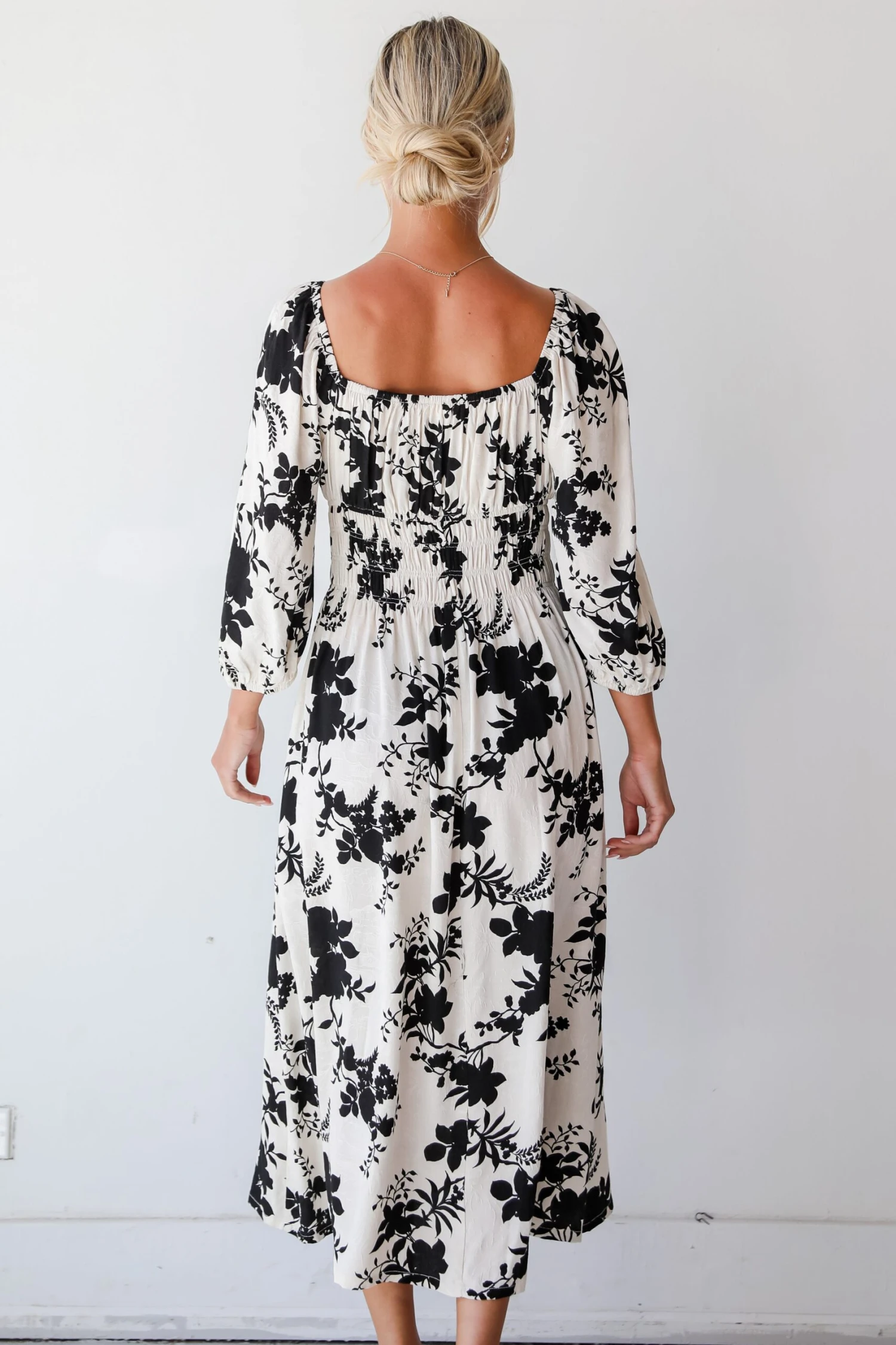 Charm your way to the top of the style ranks with the Adorably Elite Ivory Floral Midi Dress! Crafted from luxurious fabric with a delicate drape, this dress offers both comfort and style, making it the perfect choice for any special occasion. The striking contrast of ivory and black hues creates a stunning visual impact, while the intricate floral print adds a touch of romance and whimsy to the ensemble. Whether you’re attending a garden wedding or enjoying a night out under the stars, this maxi dress is sure to make a statement wherever you go. Dress it up with statement jewelry and a clutch for a formal event, or keep it casual with flats and a denim jacket for a more laid-back vibe!