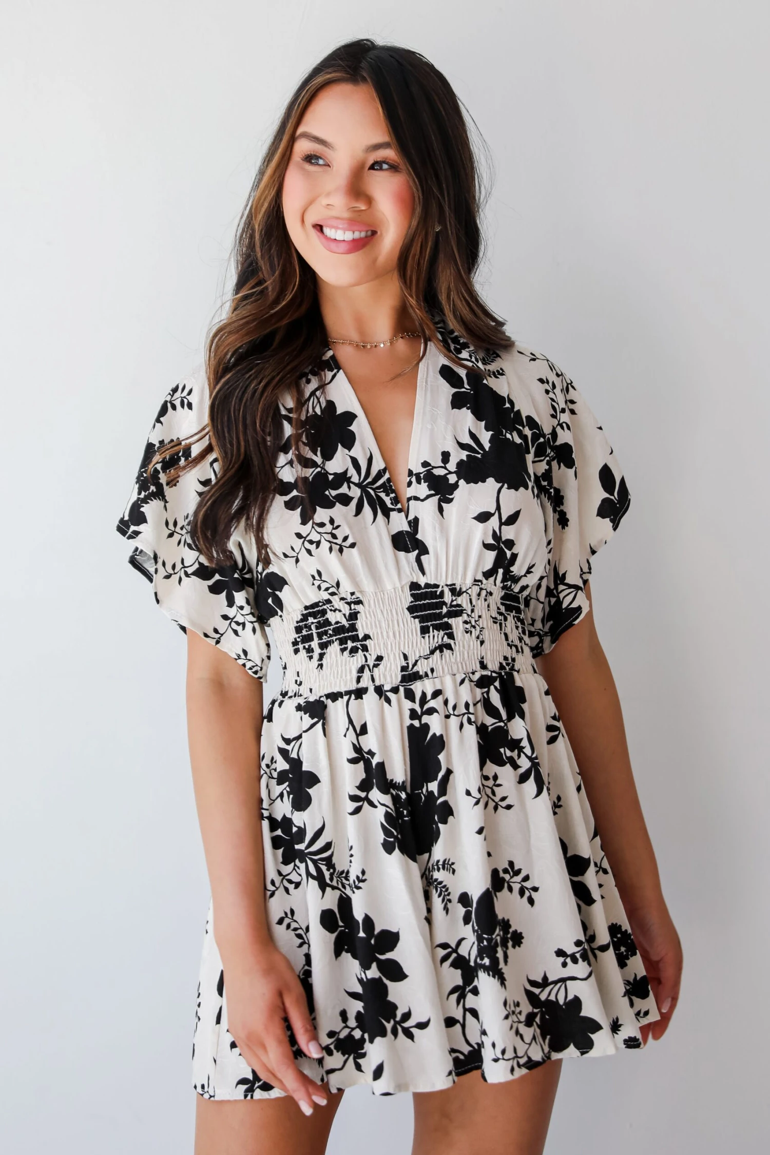 Charm your way to the top of the style ranks with the Adorably Elite Ivory Floral Romper! Crafted from lightweight and airy fabric, this romper offers both style and comfort for any occasion. The delicate ivory hue serves as the perfect canvas for the striking black floral print, adding a touch of drama and allure to the ensemble. Whether you’re attending a summer wedding or enjoying a night out with friends, this romper is sure to make a statement wherever you go. Dress it up with statement jewelry and a clutch for a special occasion, or keep it casual with flats and a denim jacket for a laid-back vibe!