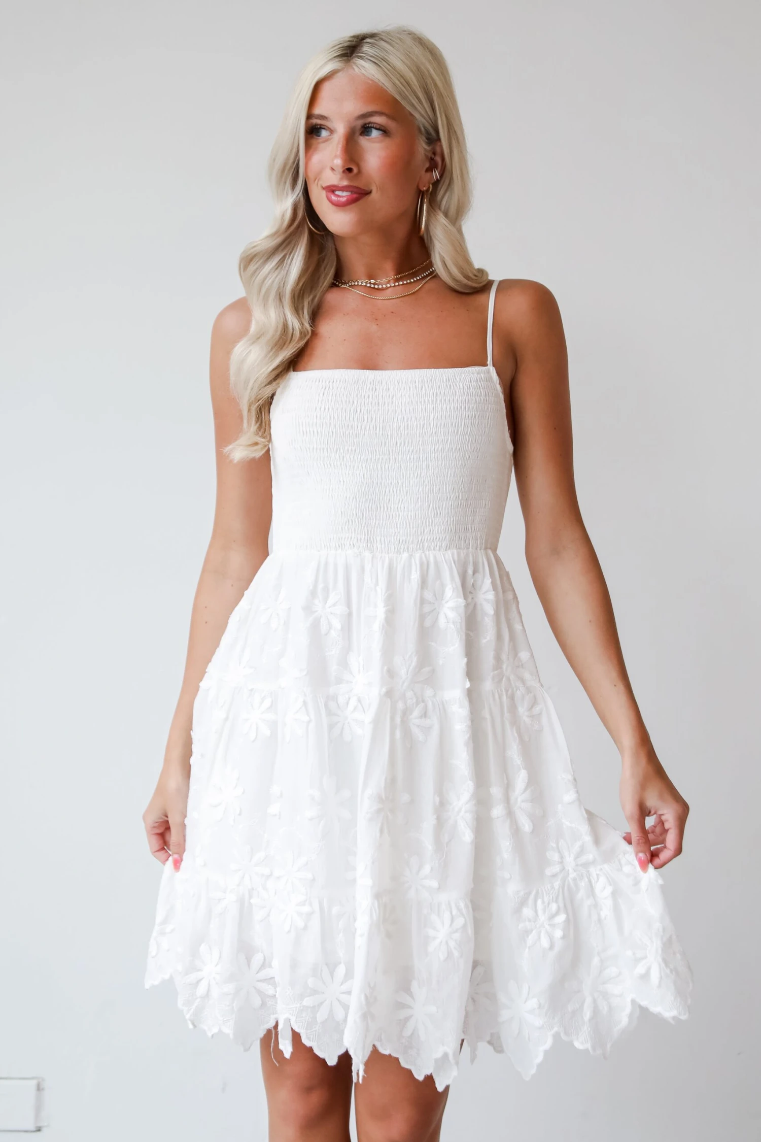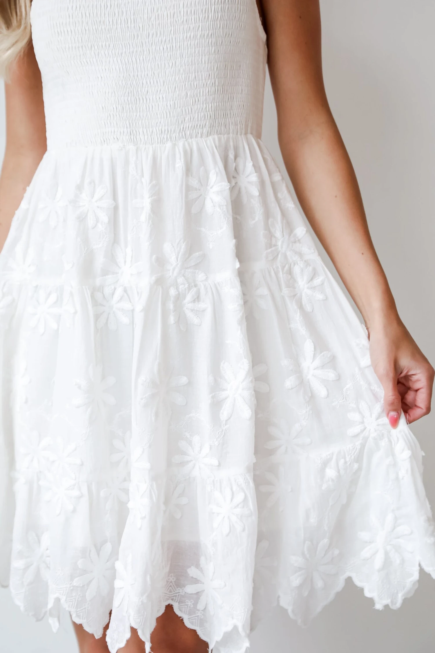 The perfect day has sunshine, a cutie on your arm, and the Airy Romance White Floral Embroidered Mini Dress! Crafted with meticulous attention to detail, this dress is designed to turn heads with its delicate embroidery and flattering silhouette. Crafted from lightweight white fabric, this mini dress offers a breezy feel that’s perfect for warm weather days. The intricate floral embroidery adds a touch of romance and whimsy, creating a beautifully intricate pattern that stands out against the pristine white backdrop. Perfect for garden parties, brunches, or romantic evenings, this white floral embroidered mini dress can be dressed up with heels and statement jewelry for a polished look, or dressed down with sandals and a sun hat for a more relaxed vibe!