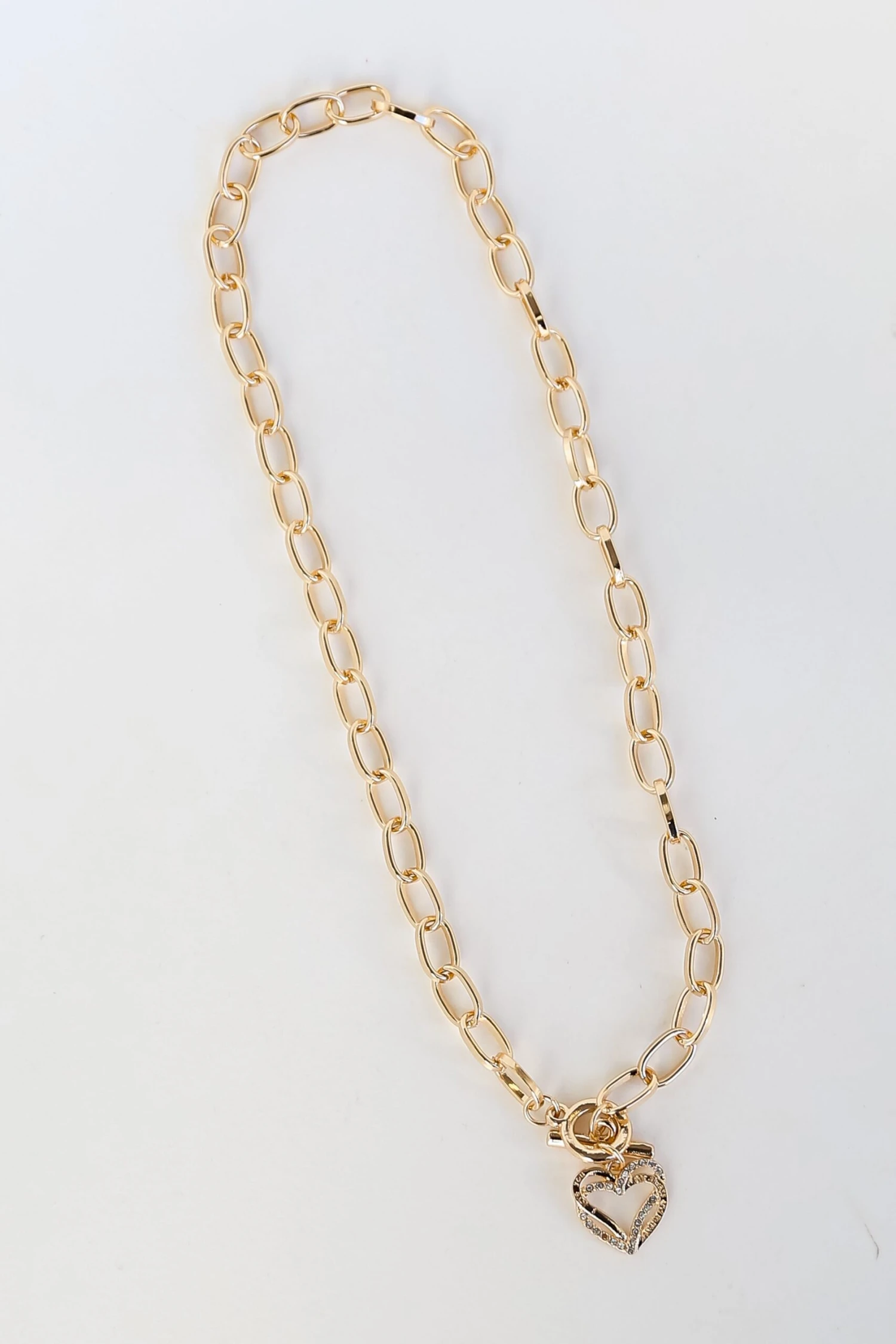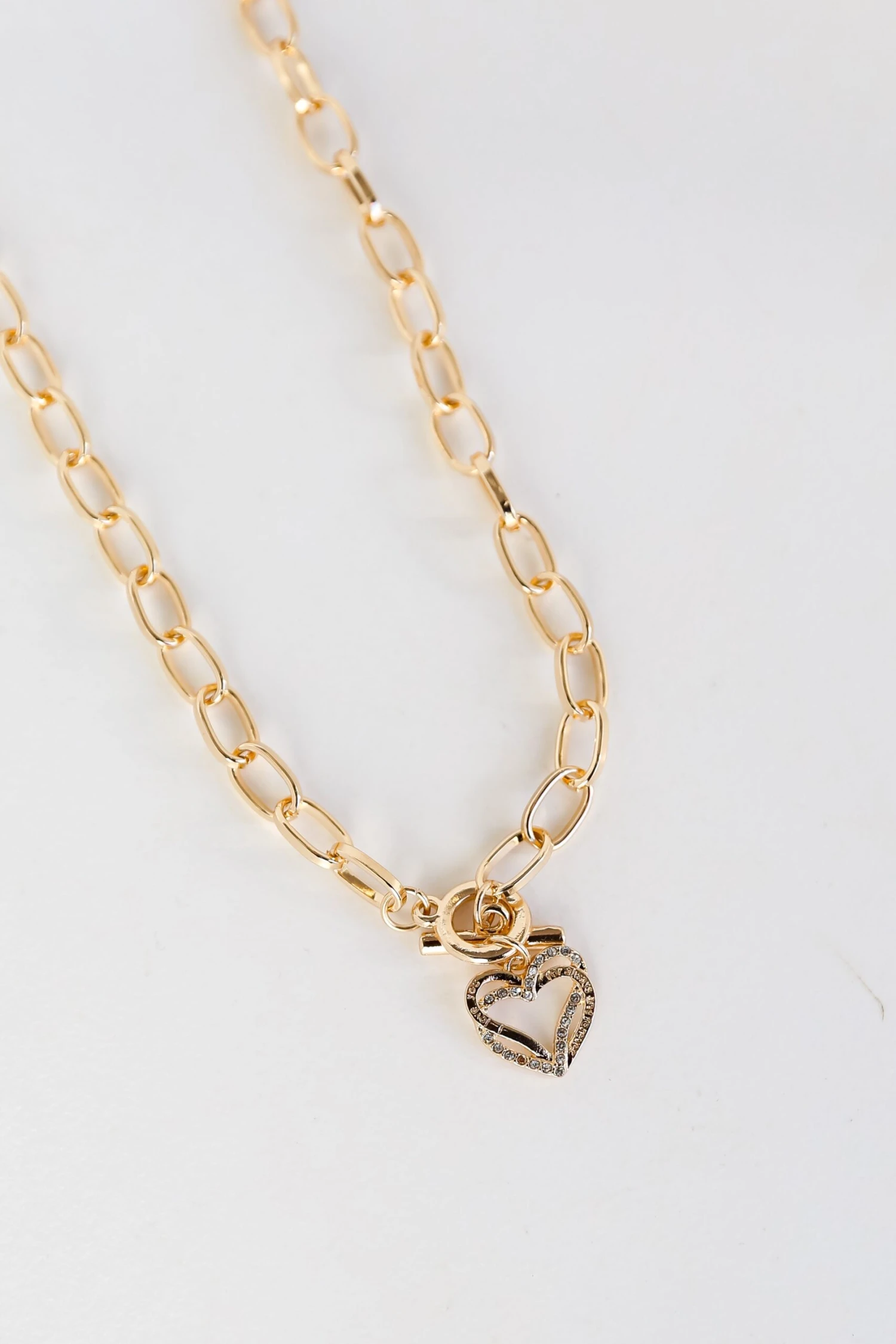 Add a touch of drama to your most fab looks with the help of a jaw-dropping piece like the Alissa Gold Heart Charm Chain Necklace! This cute necklace features a gold chainlink with a rhinestone heart charm and a toggle closure. Style the Alissa Necklace with any outfit to instantly upgrade your look!