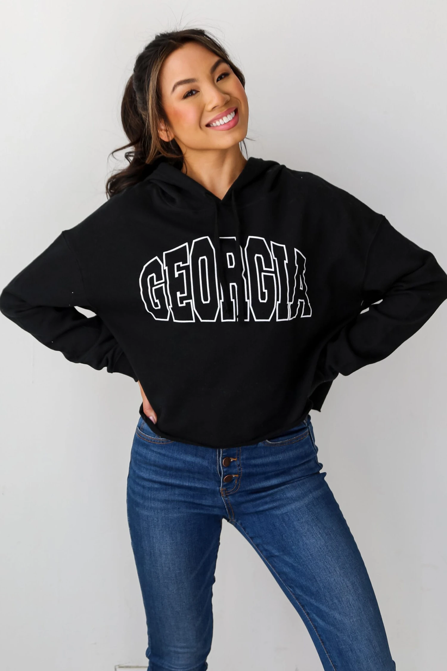 Calling all Dawgs fans, the Black Georgia Cropped Hoodie was made just for you! This comfy tee is designed with a soft and stretchy knit. It features a hooded neckline with functional drawstrings, long sleeves, a relaxed mid-crop fit, and the word “Georgia” on the front. Style the Black Georgia Cropped Hoodie with your favorite distressed denim and sneakers for the perfect game day look!