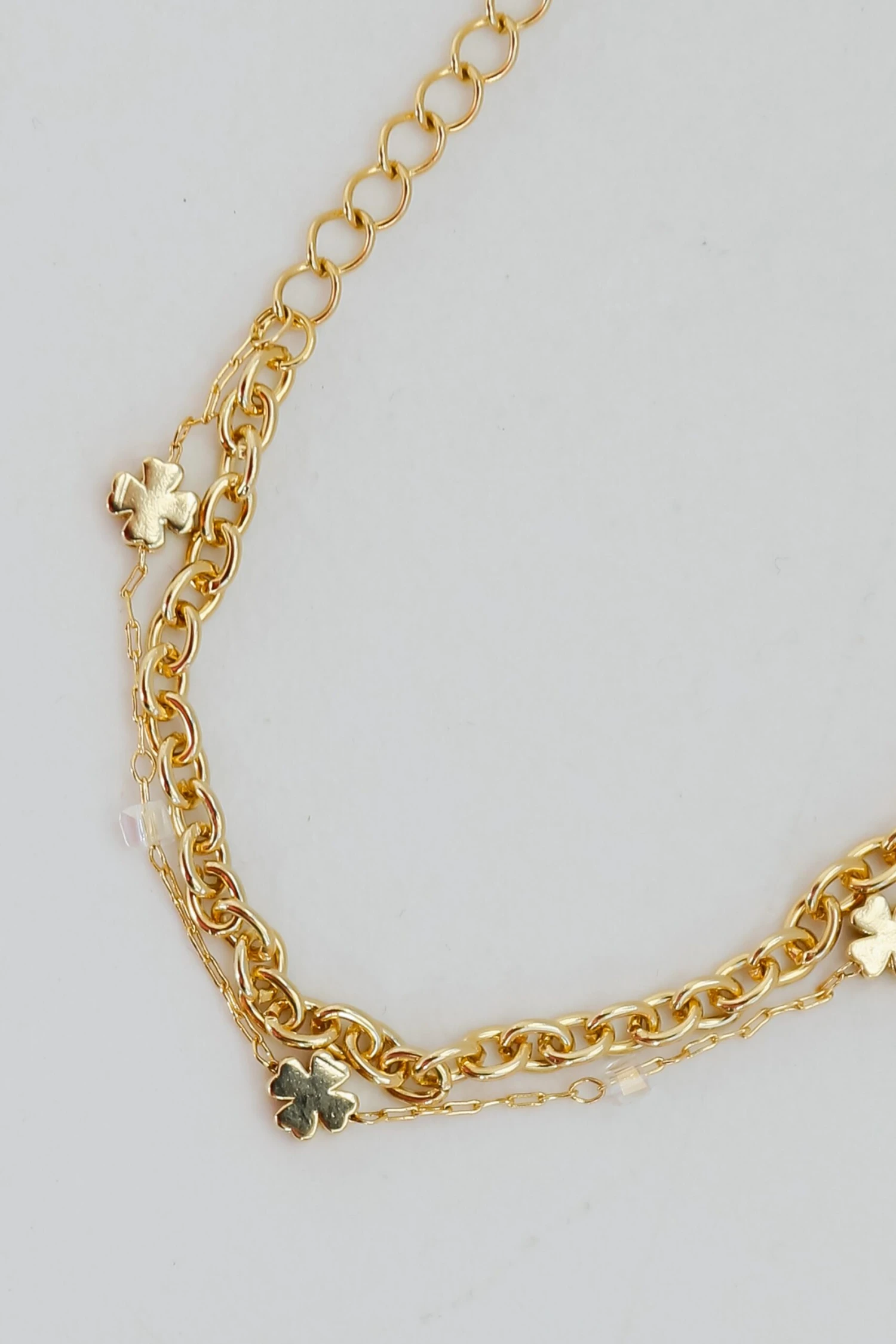 Put your OOTD over the top when you add a glittering finish like the Bridget Gold Four Leaf Clover Layered Chain Bracelet! This set of two bracelets is made of gold chains with clear beads + four leaf clover charms. Wear them on their own or stacked with other bracelets, either way you’ll love them!
