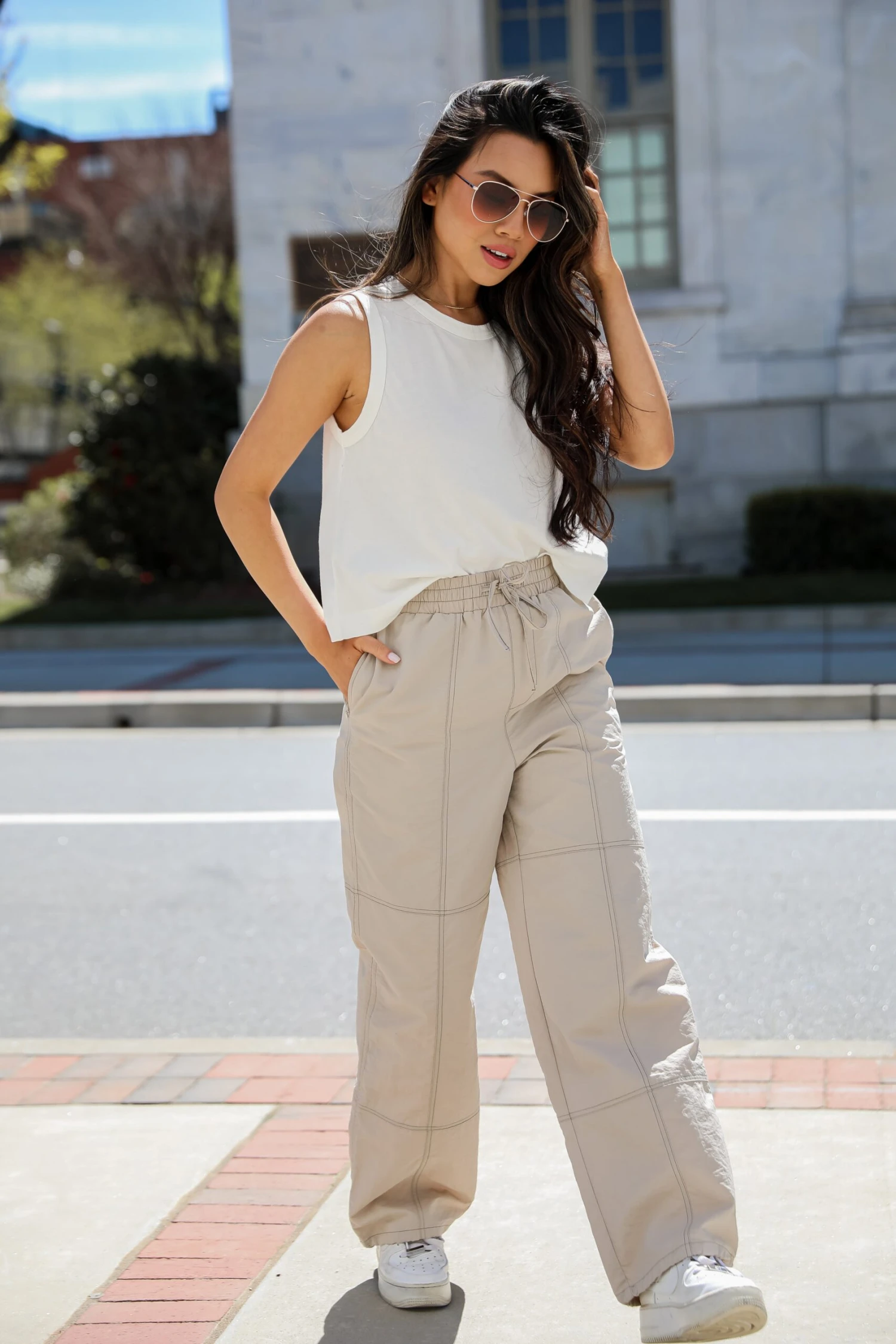 - Wide Pant Legs with Functional Drawstring Hems