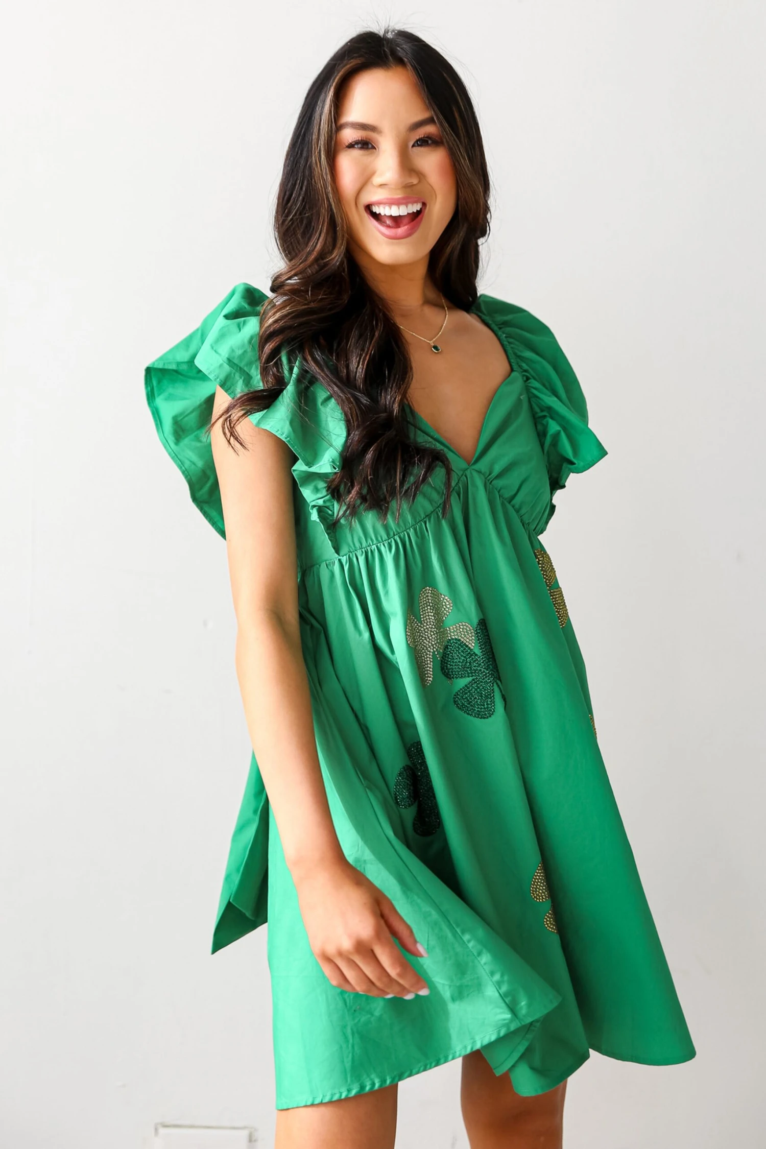 Introducing the Feeling Lucky Green Rhinestone Four Leaf Clover Mini Dress – a whimsical and charming ensemble that captures the essence of playful elegance! This mini dress is adorned with delightful green rhinestone four-leaf clovers, adding a touch of sparkle and luck to your look. The rich green hue of the dress sets a lively and vibrant tone, creating a visually striking canvas for the sparkling clover embellishments. The babydoll silhouette adds a flirty and youthful charm, with a loose and flowy fit that allows for comfortable movement while maintaining a stylish appearance. Each shimmering detail catches the light, creating a magical effect that makes this dress perfect for celebrations, parties, or any event where you want to stand out with a touch of luck and charm!