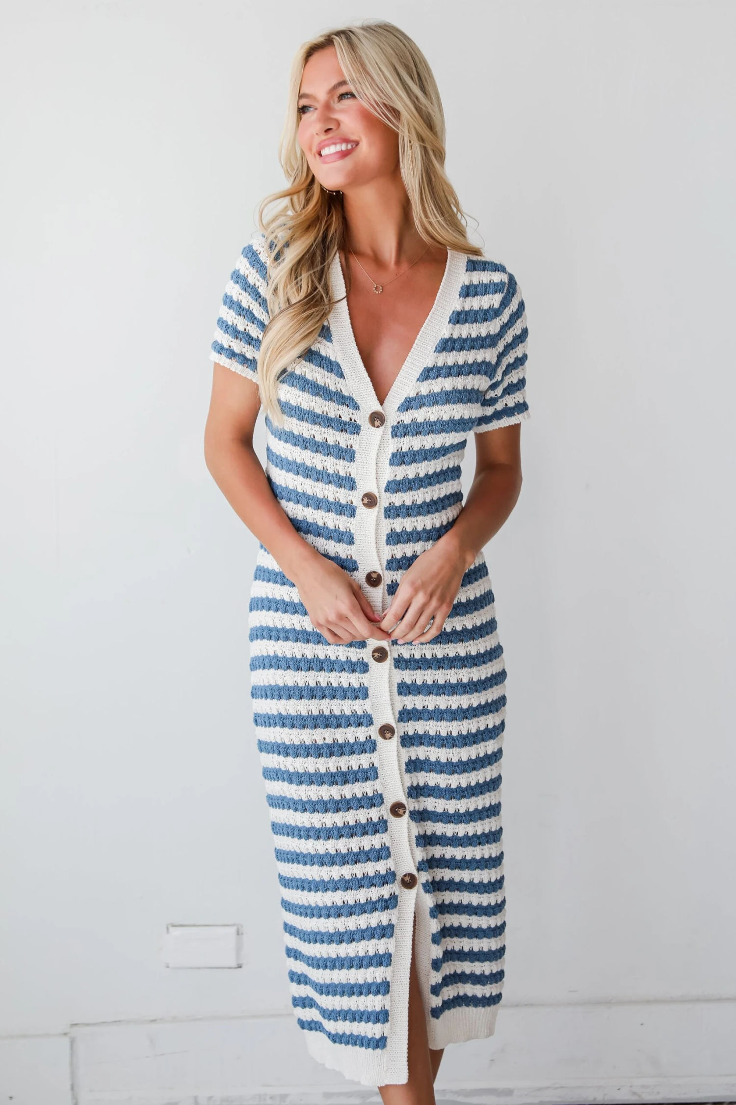 There’s nothing better than enjoying a warm day in the Feeling The Best Blue Striped Crochet Knit Midi Dress! Crafted with meticulous attention to detail and artisanal craftsmanship, this dress is a stunning expression of bohemian chic. The captivating blue stripes add a playful yet sophisticated touch to the dress, evoking a sense of wanderlust and adventure. Each stripe is intricately woven into the crochet knit fabric, creating a mesmerizing pattern that’s sure to turn heads wherever you go. Perfect for warm-weather days or balmy evenings, this dress is a versatile addition to your wardrobe. Whether worn with sandals for a casual day out or dressed up with heels for a special occasion, this midi dress is sure to make a statement!