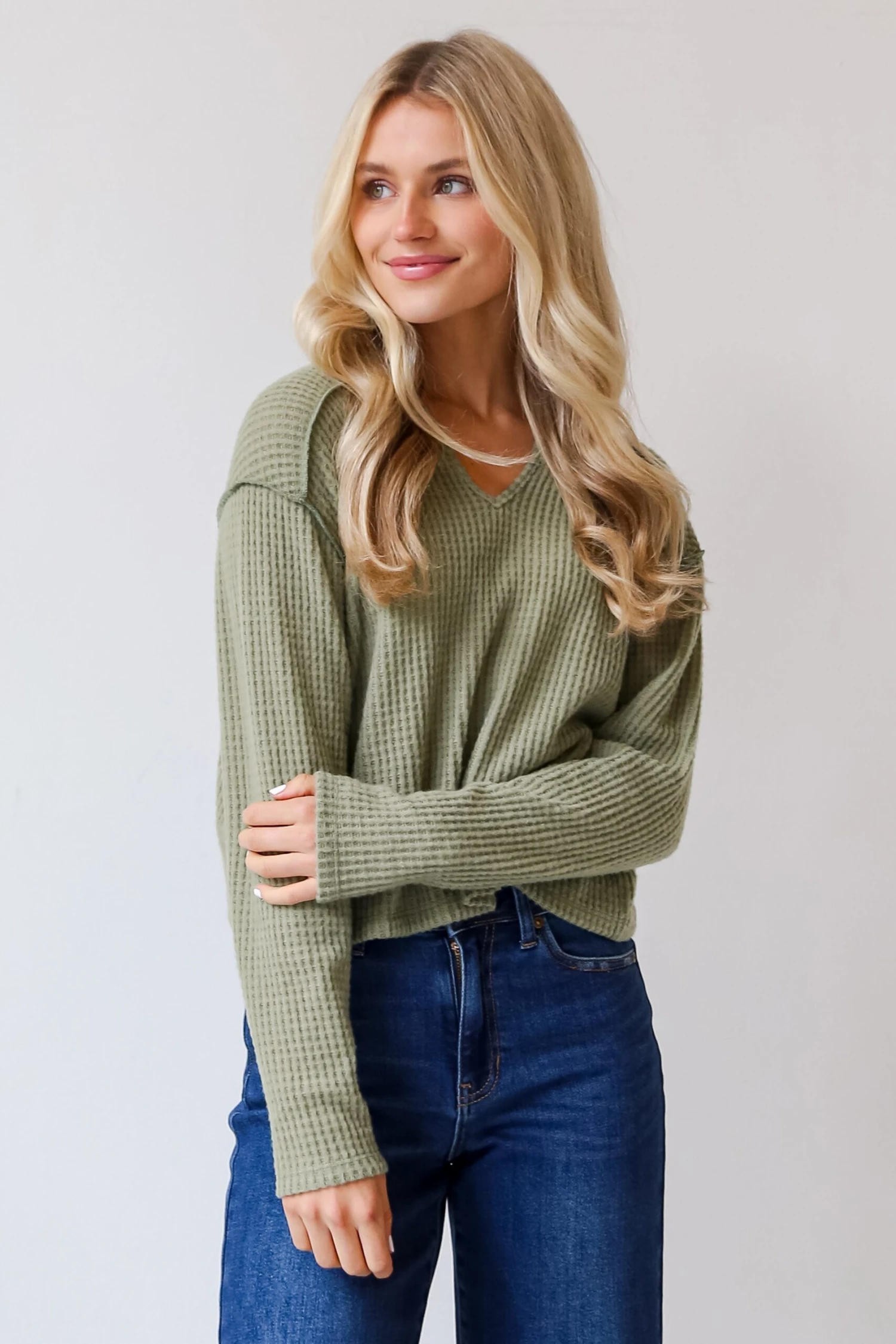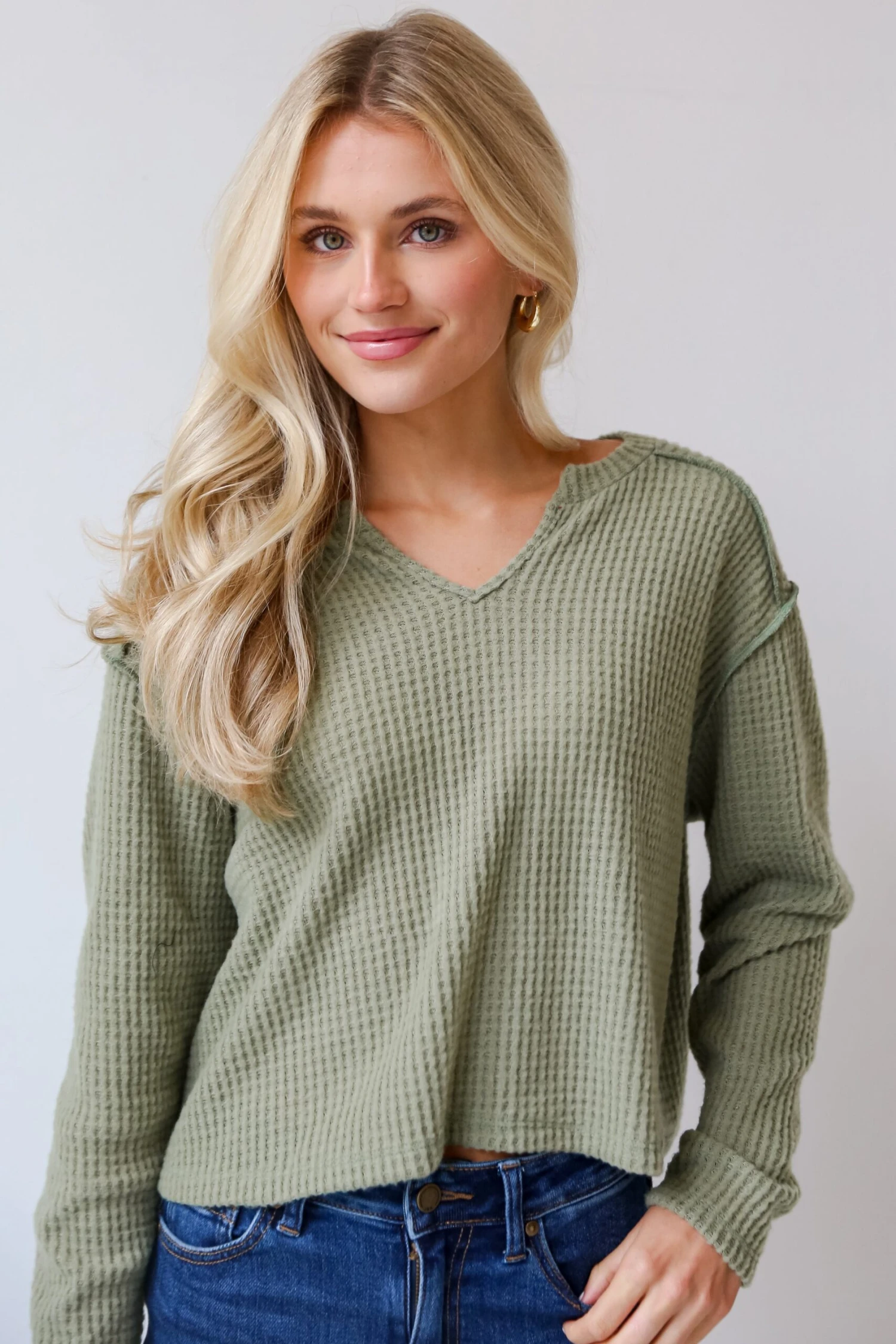 Cute meets stylish to create your new go-to, the All Day Fave Sage Brushed Waffle Knit Top! Introducing our women’s sage brushed waffle knit top—a perfect harmony of comfort and style that adds a touch of serenity to your wardrobe. This top is designed for the modern woman who values the tactile luxury of waffle knit fabric and desires a versatile piece that effortlessly transitions from casual days to laid-back elegance. Crafted from a soft and plush brushed waffle knit, this top provides a sumptuous feel against your skin, making it an ideal choice for those who appreciate comfort without compromising style. The serene sage green hue adds a touch of tranquility, creating a versatile piece that complements various bottoms and accessories. The brushed waffle knit texture adds depth and visual interest to the fabric, creating a chic and inviting look. The relaxed fit ensures ease of movement, making this top perfect for laid-back days or casual outings. The long sleeves contribute to its versatility, providing extra warmth for cooler seasons while maintaining a chic and effortless vibe!