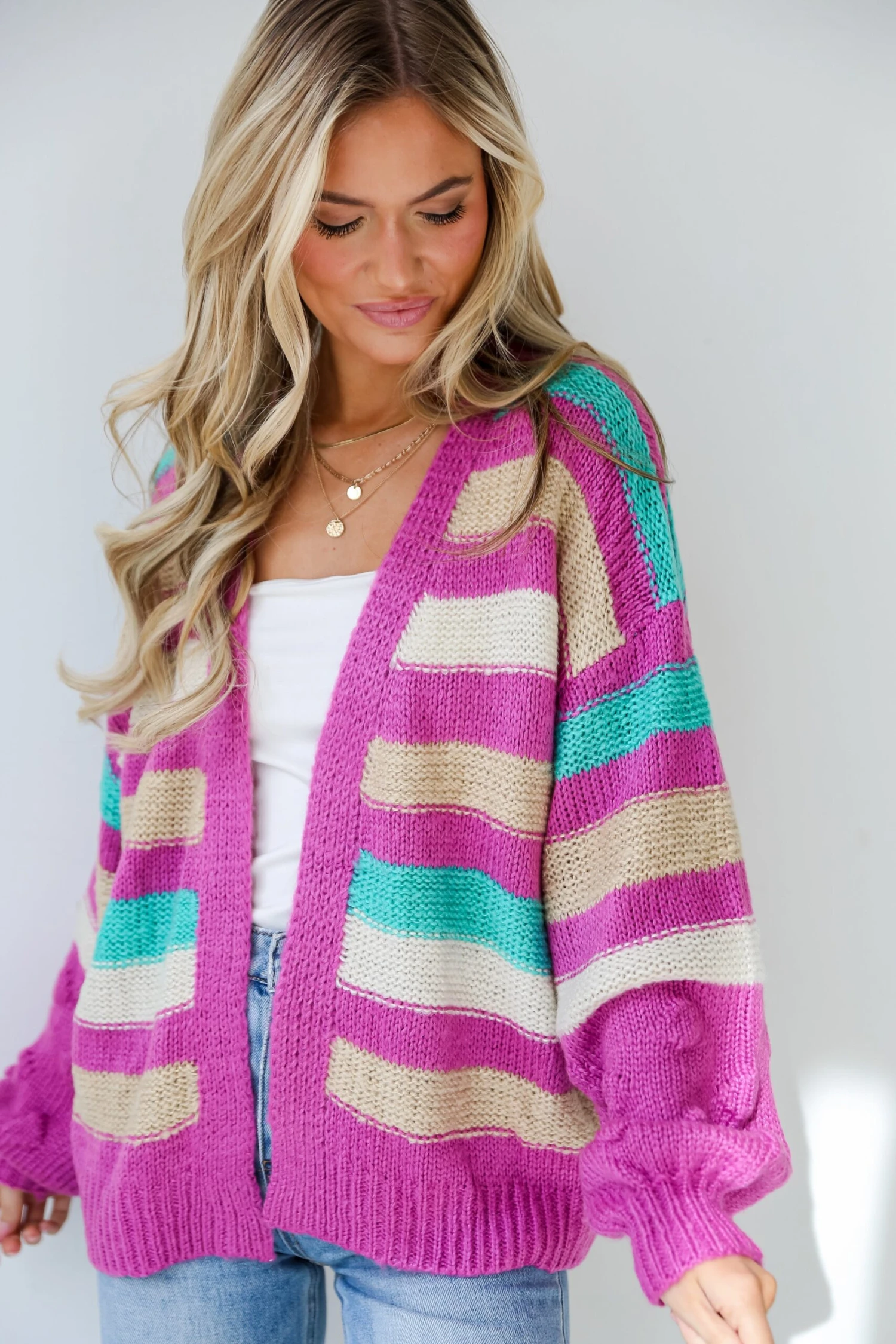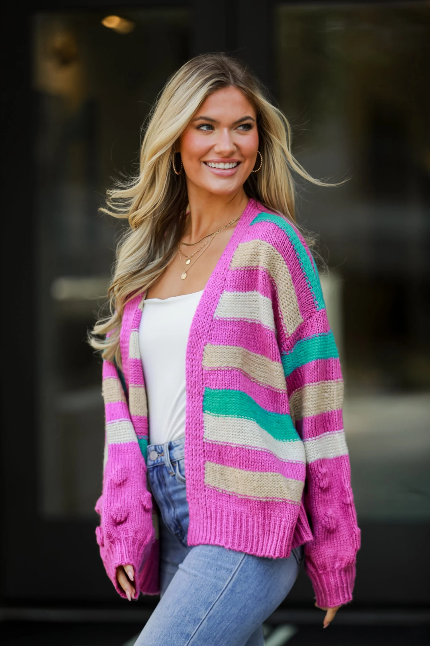 There are so many ways to wear the Easygoing Style Fuchsia Striped Sweater Cardigan, and you’re going to want to try them all! This cardigan is a celebration of classic style, featuring a delightful stripe pattern that effortlessly infuses charm into your look. Crafted from a soft and comfortable knit fabric, this cardigan ensures a cozy feel while keeping you fashionably on point. The striped design, featuring a harmonious blend of colors, adds a playful and dynamic element to the ensemble. Whether you choose a bold, contrasting stripe or a subtle, neutral combination, this cardigan provides endless options for styling!
