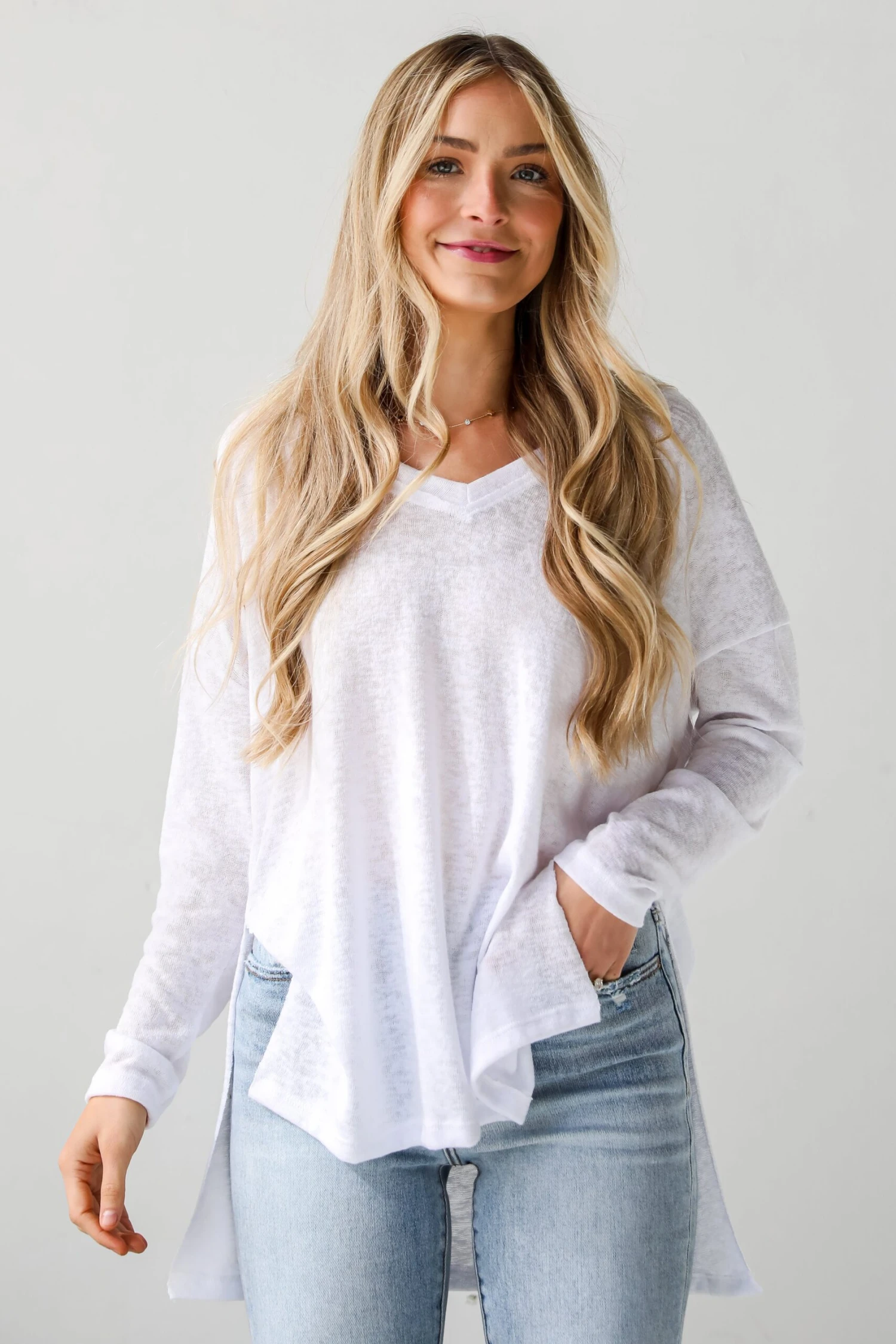 Introducing a cozy staple for cooler days: the Haley White Long Sleeve Knit Top! Crafted with comfort and style in mind, this top offers a relaxed fit and luxurious feel, perfect for lounging at home or running errands in style. Made from soft and breathable knit fabric, this top features a loose and oversized silhouette that drapes effortlessly over the body. The long sleeves provide added warmth and coverage, while the relaxed fit ensures comfort and ease of movement. With its effortless style and cozy feel, this oversized knit top is perfect for embracing laid-back chic on any occasion. Whether worn for a relaxed day at home or a casual outing with friends, it adds a touch of comfort and sophistication to your ensemble!