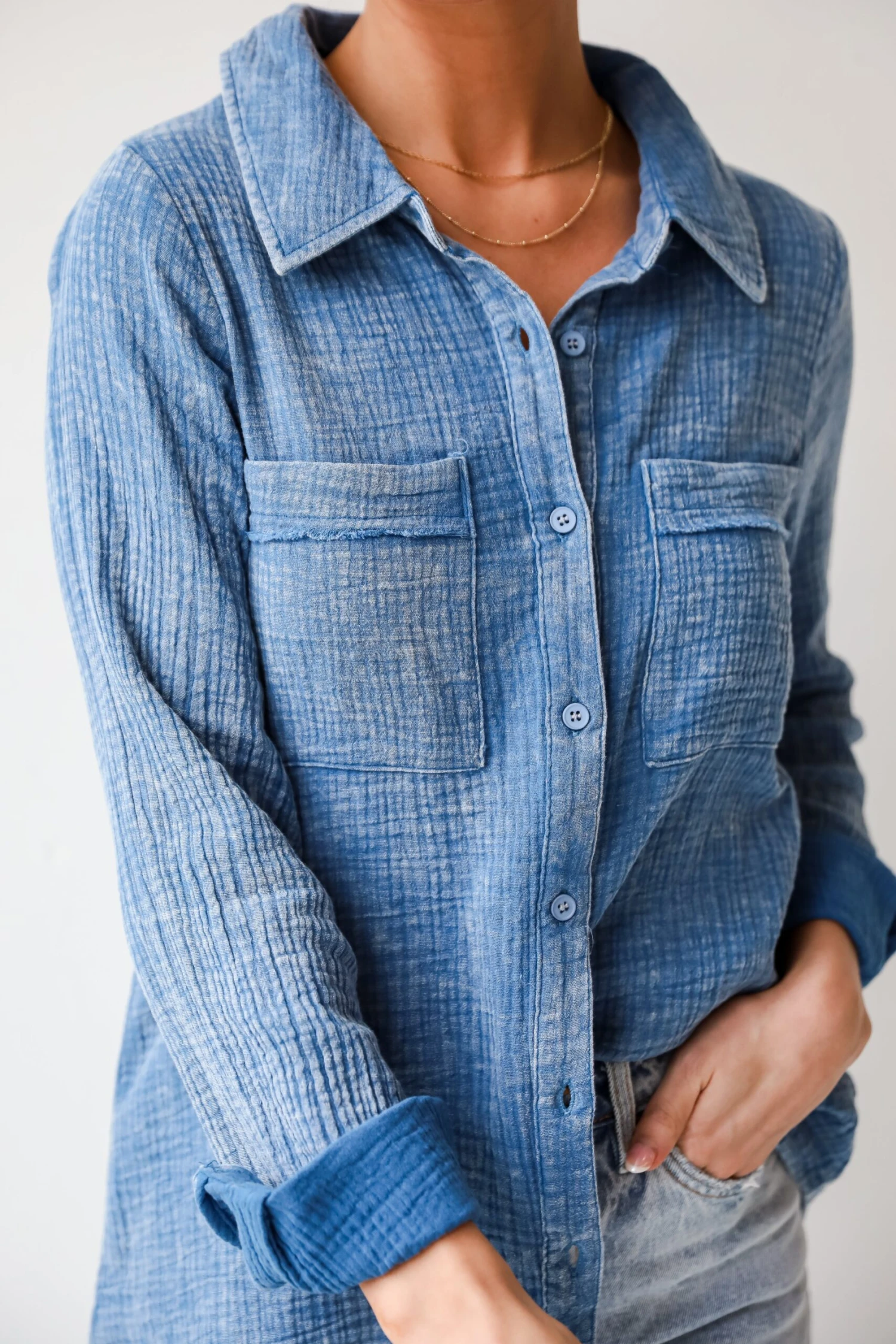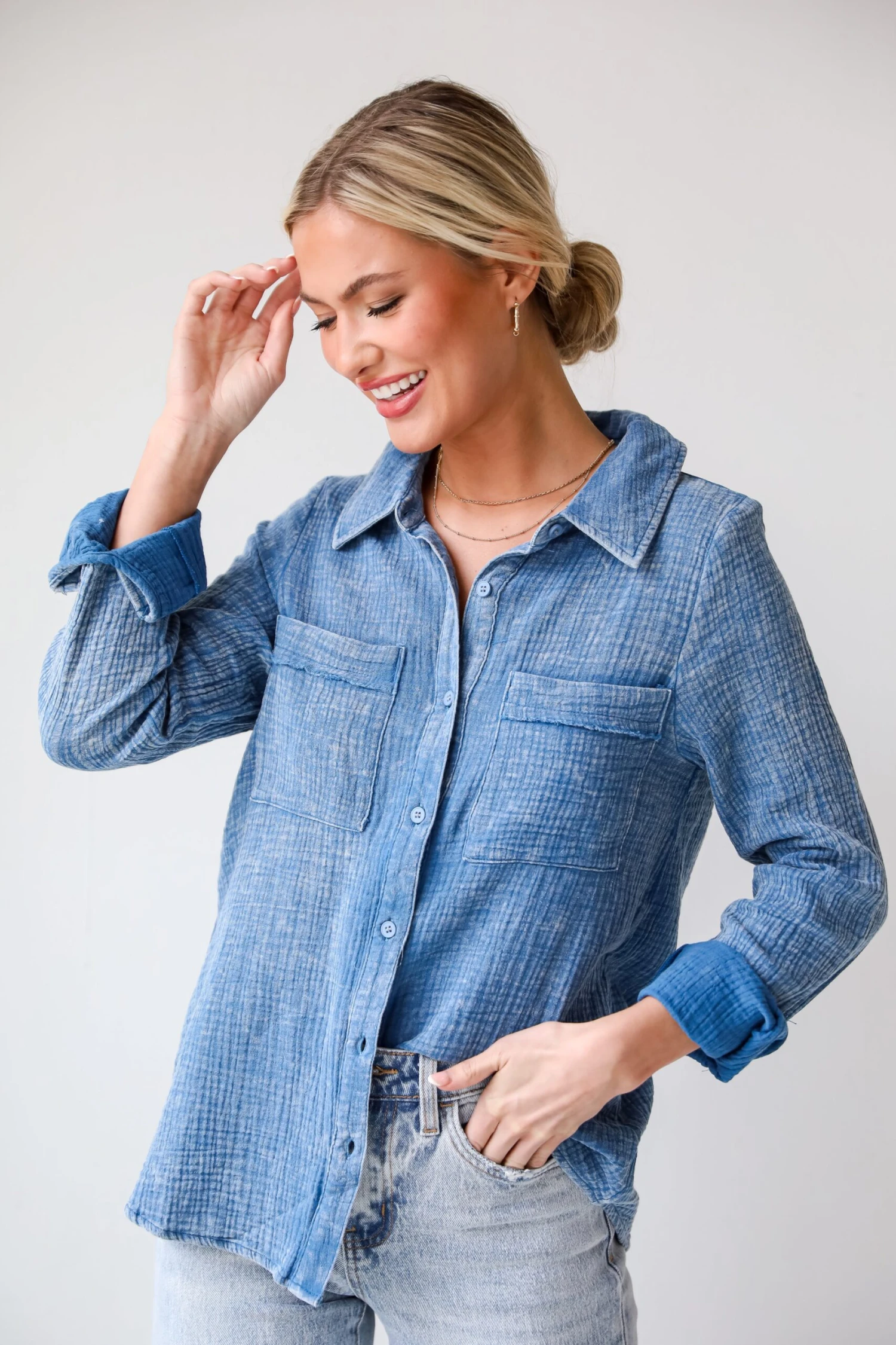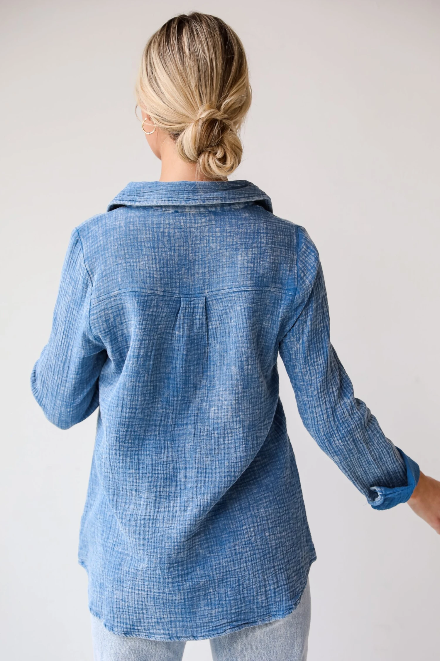 Introducing the Morgan Denim Linen Button-Up Blouse – a perfect blend of vintage-inspired charm and contemporary style. This unique women’s blouse combines the casual sophistication of linen with the edgy allure of acid wash, resulting in a statement piece that is both timeless and on-trend. The blue acid wash infuses a sense of laid-back coolness into the linen fabric, creating a one-of-a-kind aesthetic that mirrors the natural beauty of coastal landscapes. The subtle variations in color and texture add depth and character to the blouse, giving it a relaxed and lived-in feel. Pair it with your favorite denim for a casual yet chic look or dress it up with tailored pants or a skirt for a more polished ensemble. The unique combination of acid wash and linen makes this blouse a standout choice for expressing both individuality and contemporary style!