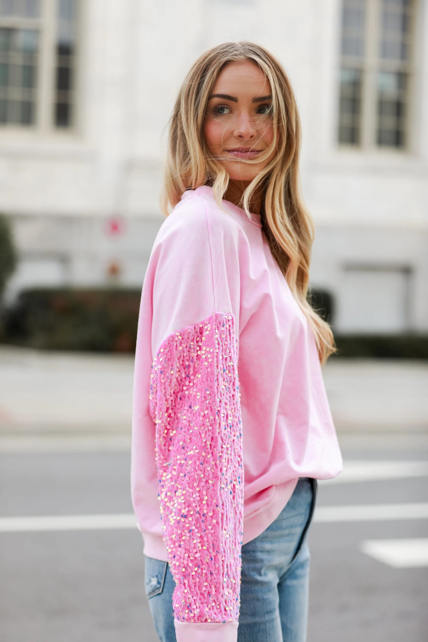 Take a glamour stance for you next event with the Radiant Always Pink Sequin Sleeve Pullover! This pullover is a celebration of textures and details, combining the soft allure of pink with the luxurious touch of velvet and the sparkling elegance of sequins. The main body of the pullover, in a delightful shade of pink, offers a cozy and relaxed fit that invites you to embrace comfort without compromising on style. The velvet long sleeves add a touch of opulence and tactility, creating a rich contrast that elevates the overall aesthetic. Adorning the velvet sleeves are intricate sequin embellishments, strategically placed to catch the light and create a shimmering effect. The sequins add a playful and festive touch, turning this pullover into a versatile piece that effortlessly transitions from casual outings to more spirited occasions!