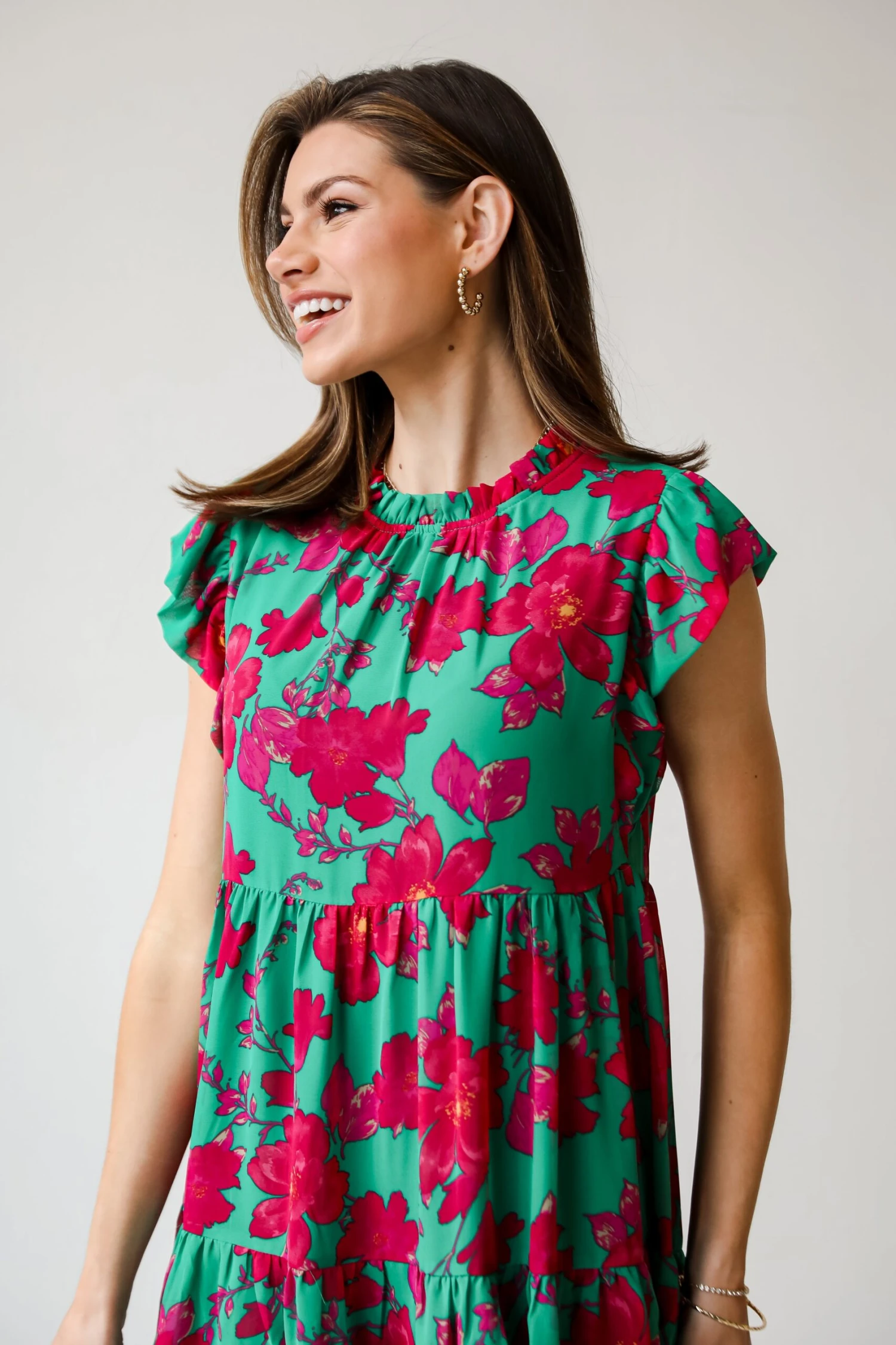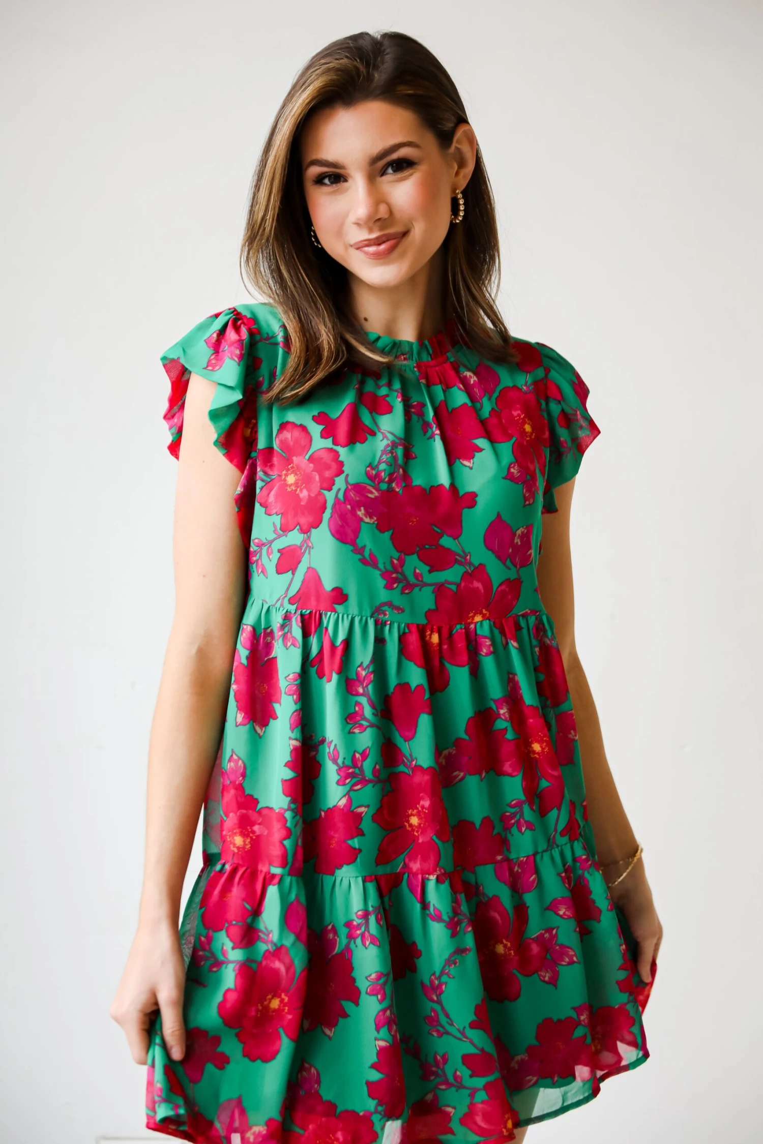 Love will always bloom when you meet your crush wearing the Sweetest Emotion Kelly Green Tiered Floral Mini Dress! This delightful dress is a celebration of color, combining the lively hues of kelly green with a sweet and intricate pink floral pattern. The tiered design of the mini dress adds a flirty and dynamic element, creating movement and a flowy silhouette that’s perfect for both casual outings and special occasions. The kelly green backdrop serves as a refreshing canvas for the whimsical pink floral print, evoking a sense of joy and optimism. This dress is a versatile statement piece that can be dressed up with heels for a garden party or paired with sandals for a laid-back weekend brunch!