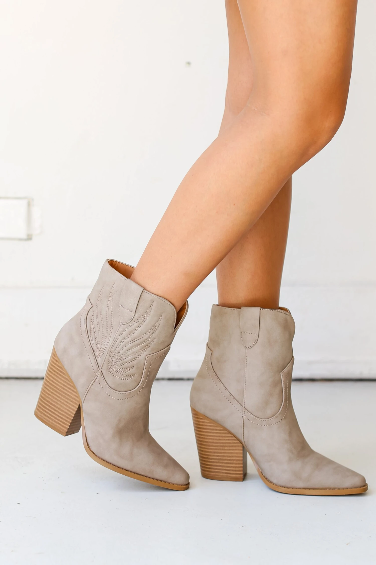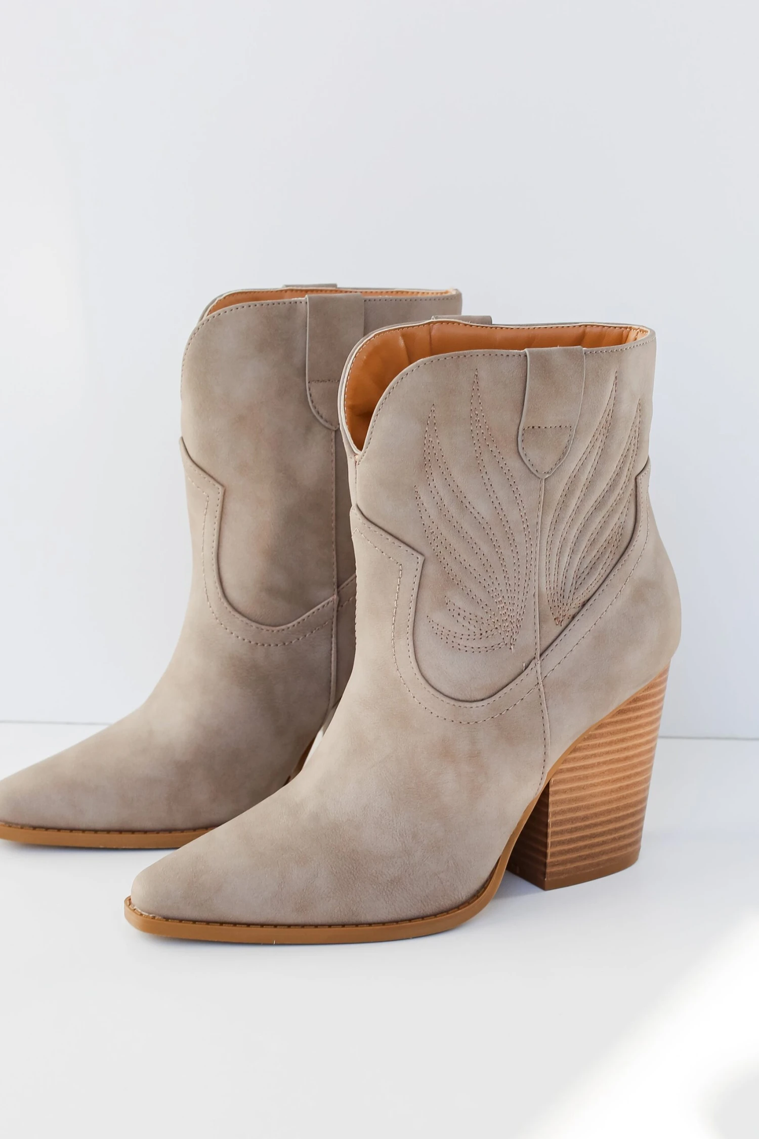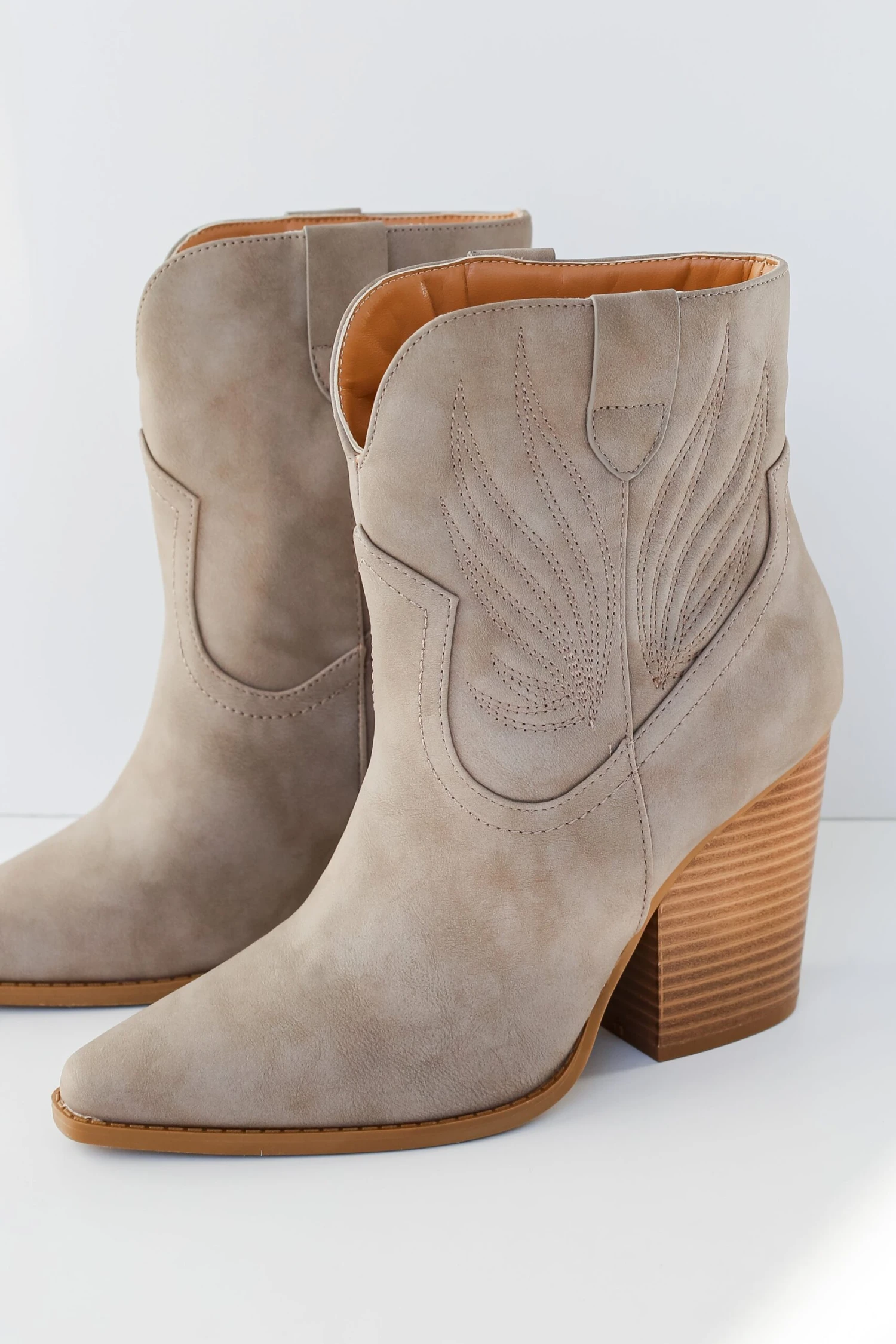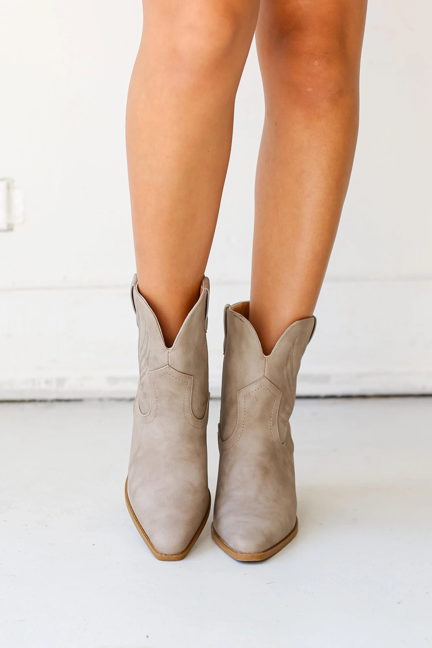 The Take A Look Taupe Western Booties are the perfect way to add some cowgirl chicness to your everyday style! These cute ankle booties are designed with a soft faux leather with western-style stitching. They feature a pointed toe and a block heel. They also feature an ankle-high shaft with pull tabs at each side that offer an easy on-and-off design. Style the Take A Look Western Booties with your favorite denim + sweaters for a boho vibe!