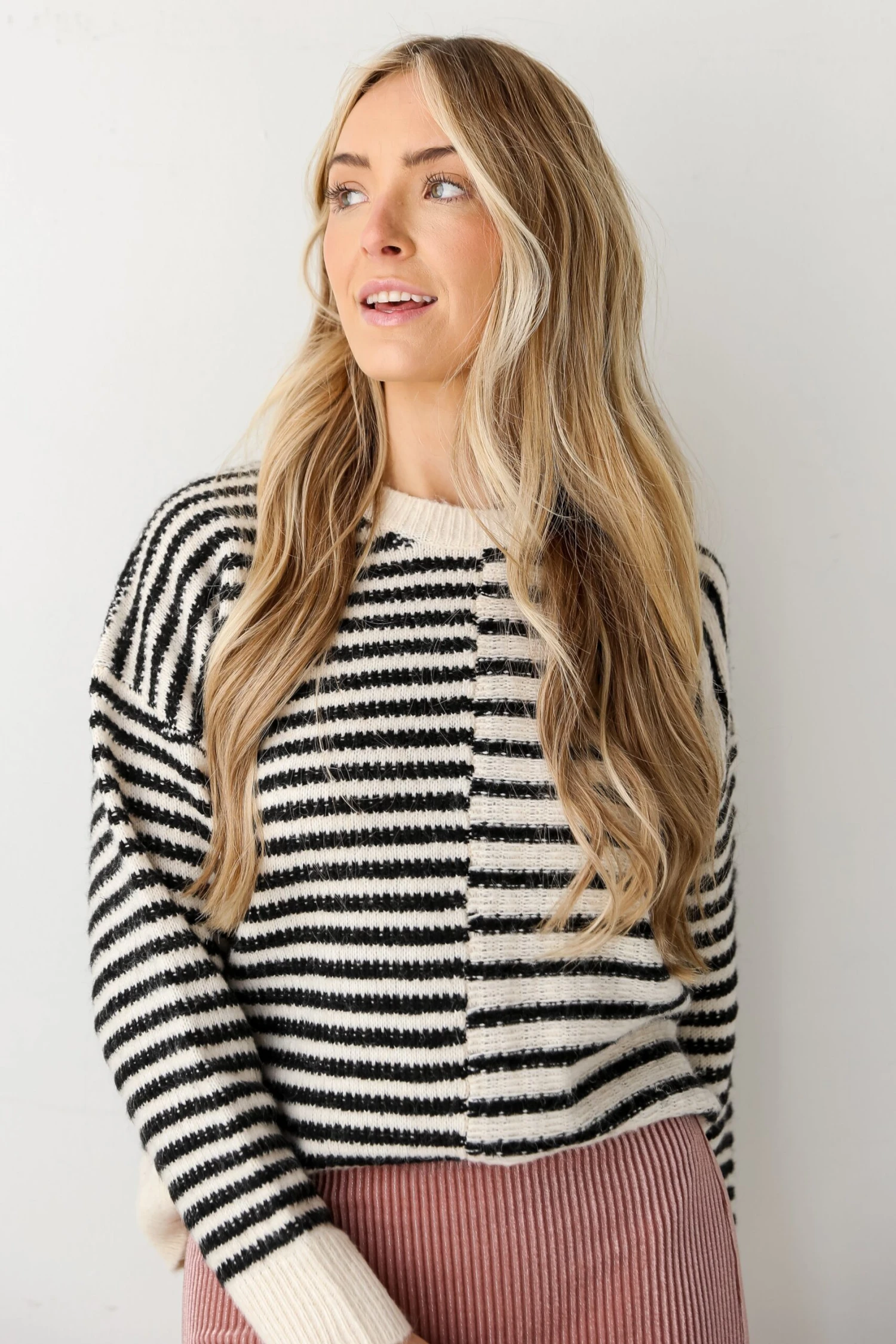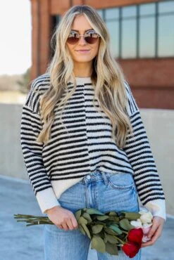 Spend your day looking like a total sweetie in the Warmest Intentions Cream Striped Sweater! This cozy sweater features a sophisticated black and cream stripe pattern, creating a versatile and chic look suitable for any occasion. Crafted from high-quality materials, this sweater offers both comfort and durability, making it a must-have addition to your winter wardrobe. The contrasting black and cream stripes add a touch of visual interest, elevating the sweater’s design and ensuring it stands out in a crowd.Â