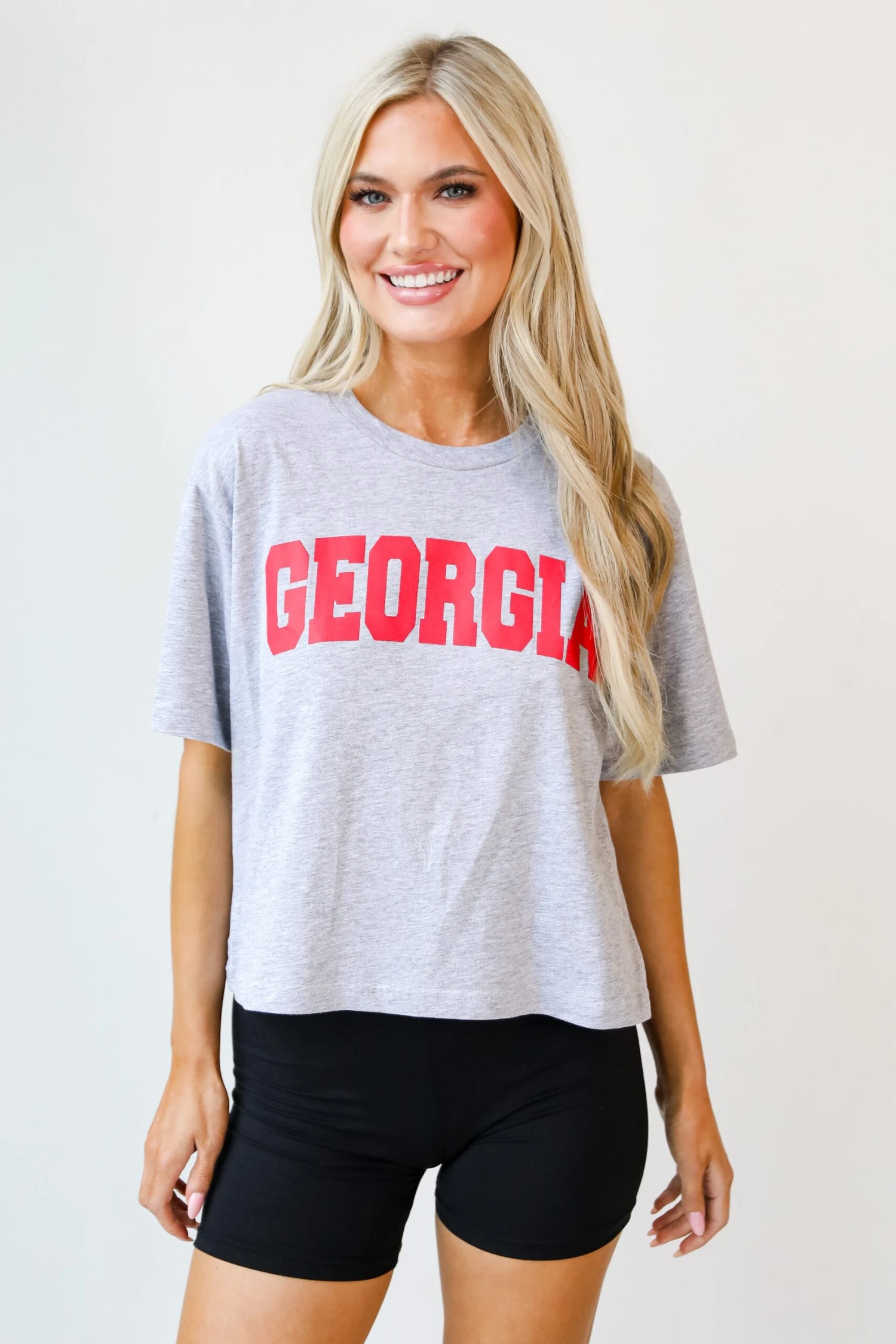 Calling all Dawgs fans, the Heather Grey Georgia Cropped Tee was made just for you! This comfy tee is designed with a soft and stretchy knit. It features a crew neckline, short sleeves, a relaxed fit, and the word “Georgia” on the front. Style the Heather Grey Georgia Cropped Tee with your favorite distressed denim and sneakers for the perfect game day look!