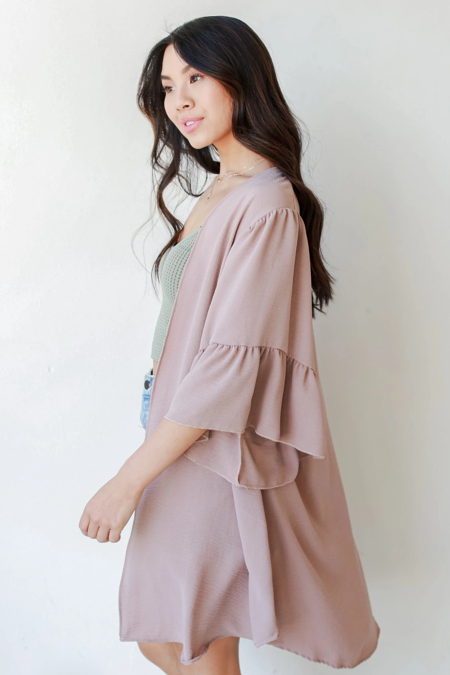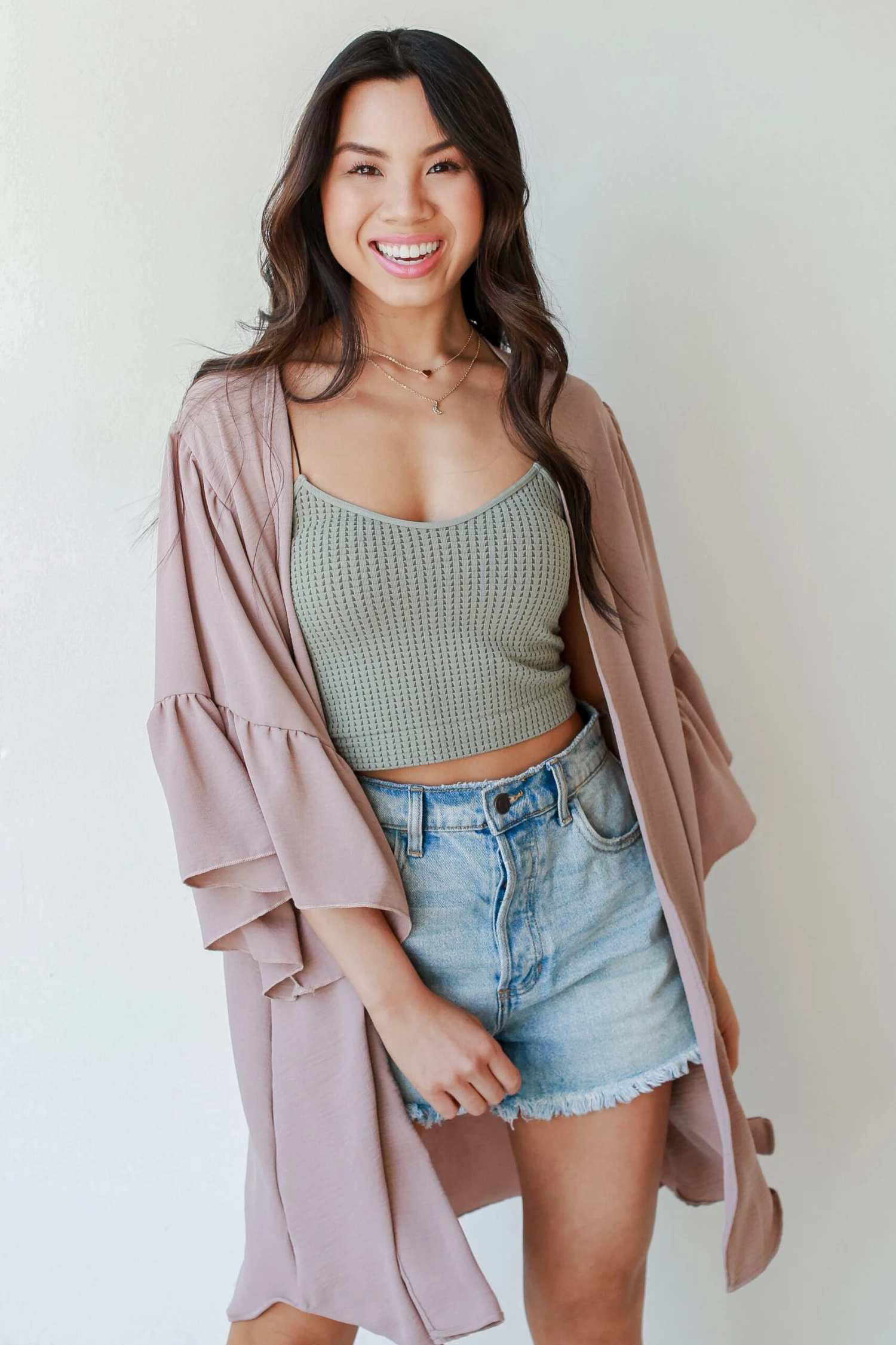 We promise that you’ll absolutely love the Keep Your Promises Ruffle Kimono! This cute cardigan is made of a lightweight woven knit. It has an open front with no closures, 3/4 length ruffle sleeves, and an oversized fit. Style the Keep Your Promises Ruffle Kimono over a bodysuit and denim for an easy outfit! Available in 3 colors.