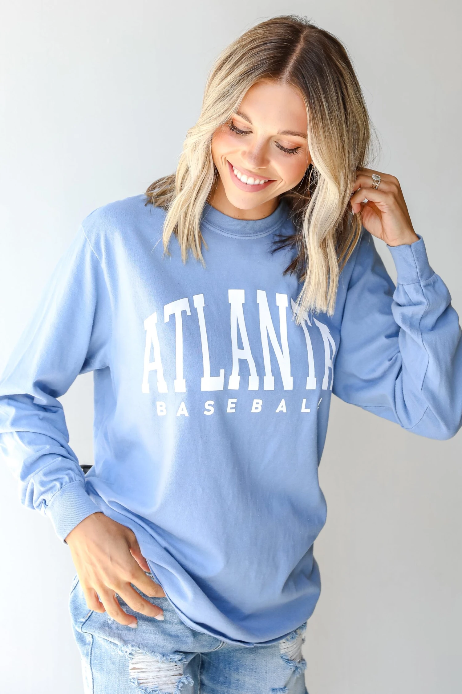 Calling all Braves fans, the Light Blue Atlanta Baseball Long Sleeve Tee was made just for you! This comfy tee is designed with a soft and stretchy knit. It features a crew neckline, long sleeves, a relaxed fit, and the words “Atlanta Baseball” on the front. Style the Light Blue Atlanta Baseball Long Sleeve Tee with your favorite denim shorts and a baseball hat for the perfect game day look!