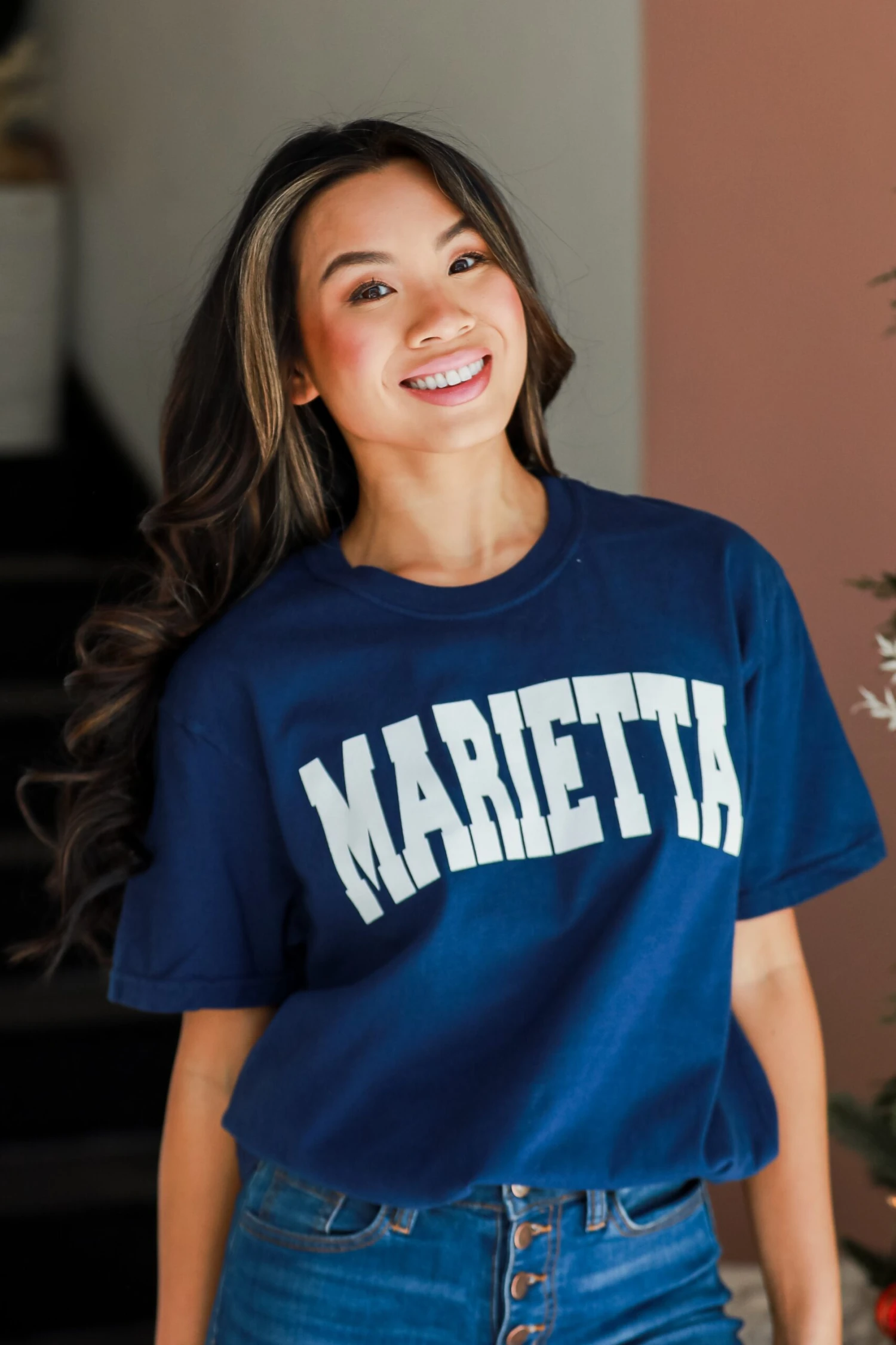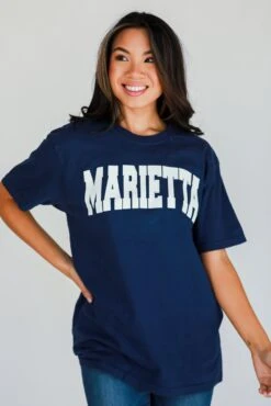 Calling all Marietta residents, the Navy Marietta Tee was made just for you! This comfy tee is designed with a soft and stretchy knit. It features a crew neckline, short sleeves, a relaxed fit, and the word “Marietta” on the front. Style the Navy Marietta Tee with your favorite denim shorts and sneakers for a casual daytime look!
