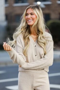 FINAL SALE – Weekends At Home Taupe Fuzzy Knit Sweater Cardigan