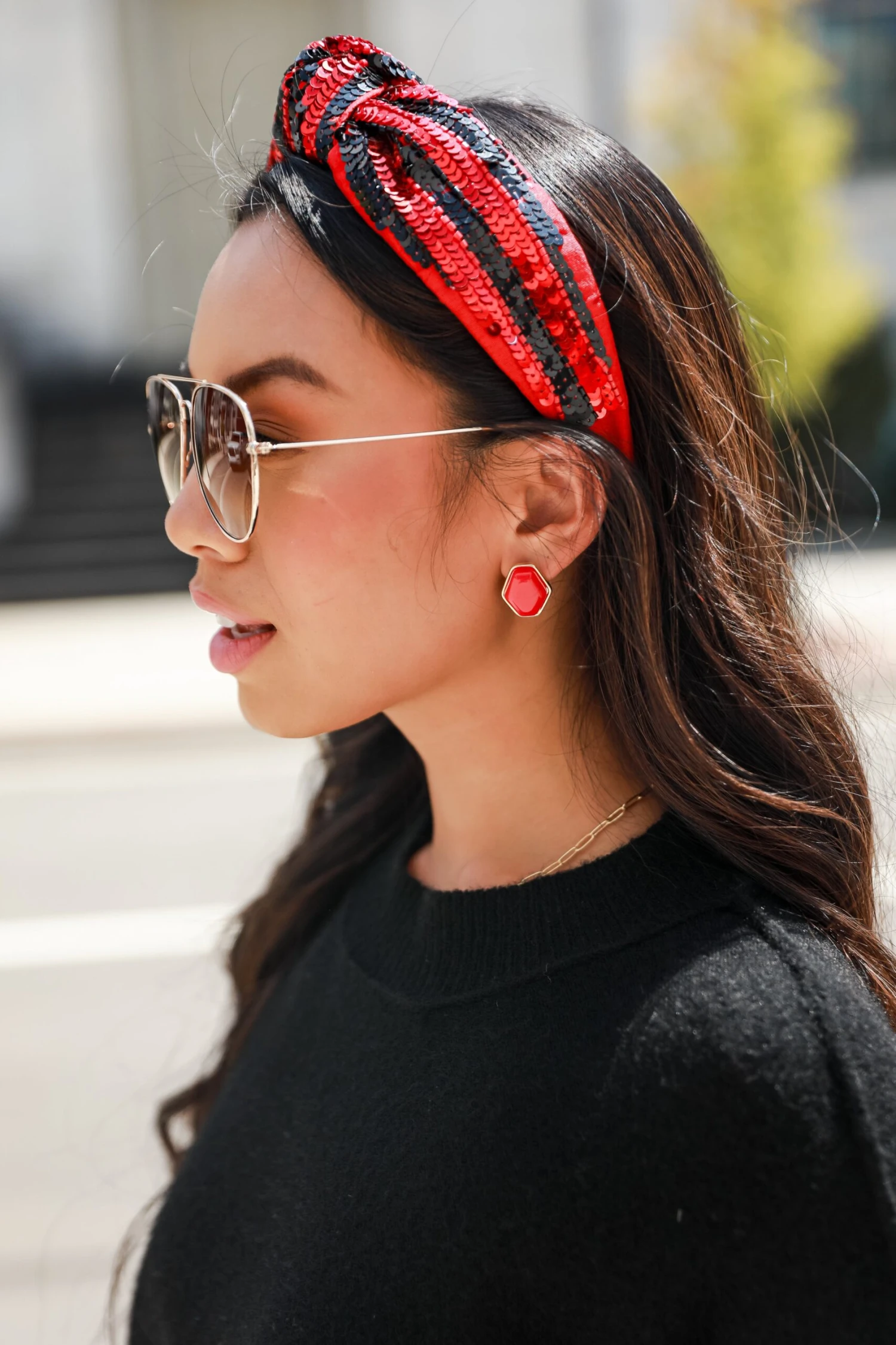 Heading to Athens soon? The Red + Black Sequin Knotted Headband would be the perfect finishing touch to your game day look! This adorable headband is designed with red and black sequins with a knot detail on the top!