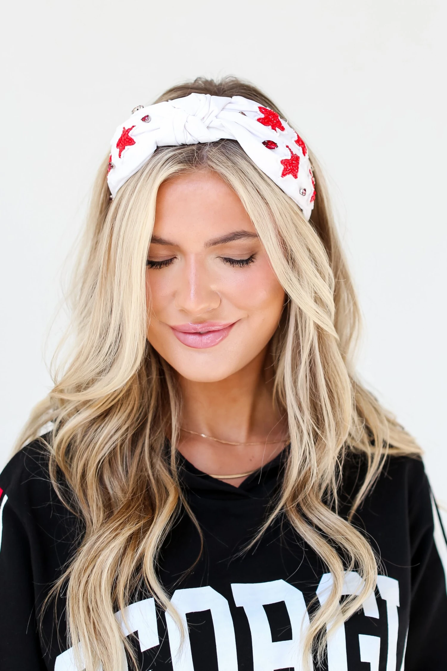 Heading to Athens soon? The Red + White Star + Gemstone Knotted Headband would be the perfect finishing touch to your game day look! This adorable headband is designed with a soft knit material red beaded stars + gemstones with a knot detail on the top!