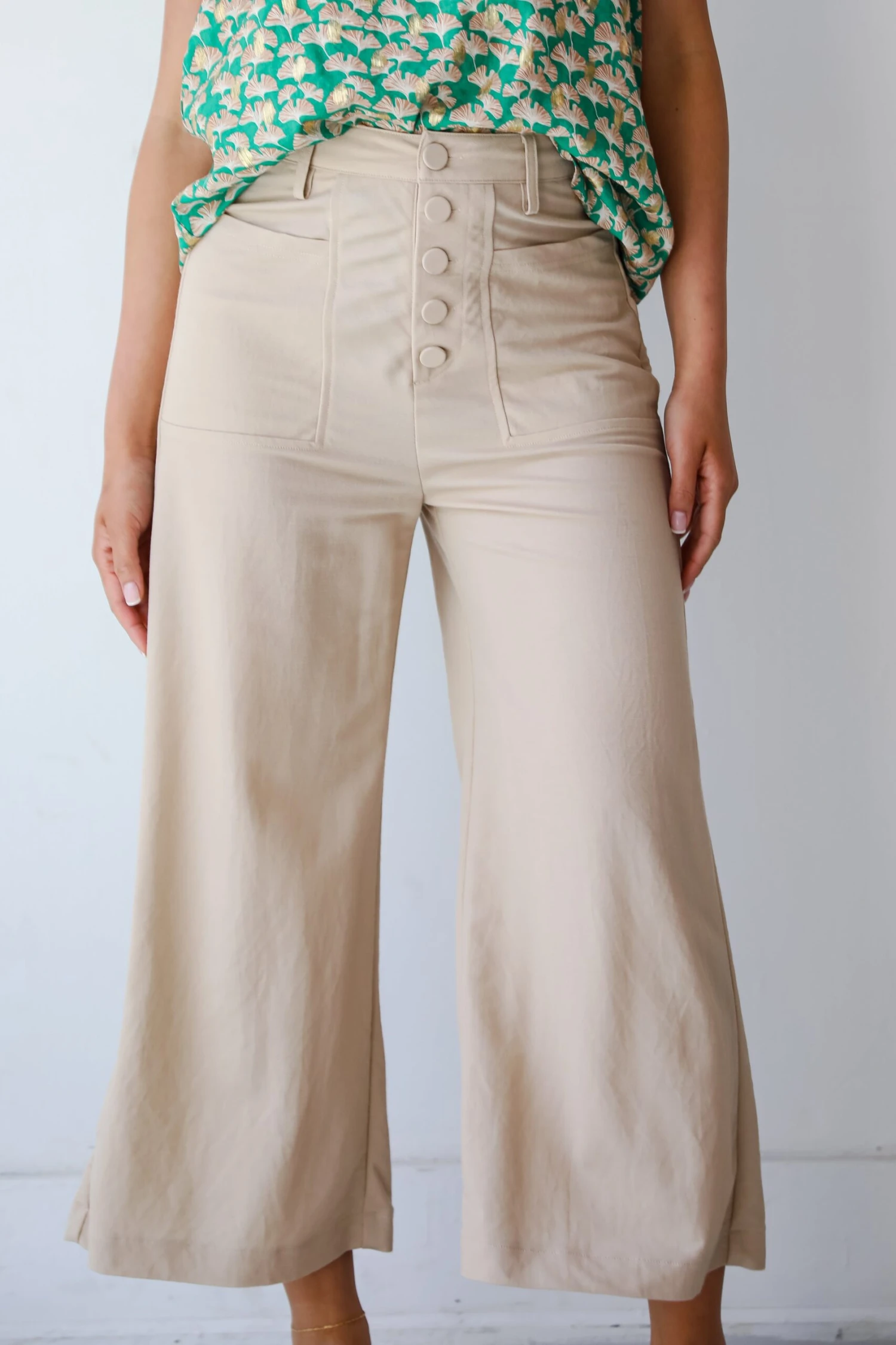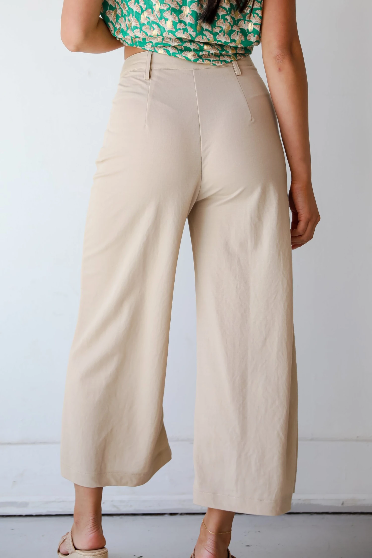 The Stylish Journey Natural Culotte Trouser Pants have all the makings of a perfect OOTD! Crafted from soft and lightweight fabric, these pants offer both comfort and style for any occasion. The timeless taupe hue exudes understated elegance, making these pants perfect for both casual and dressy ensembles. Whether you’re heading to the office or meeting friends for brunch, these culotte trousers are sure to elevate your look with their refined silhouette. Designed with a high rise waist, these pants cinch in at the narrowest part of your waist before flaring out into wide-leg culottes. The relaxed fit provides comfort and ease of movement, while the cropped length adds a contemporary touch!