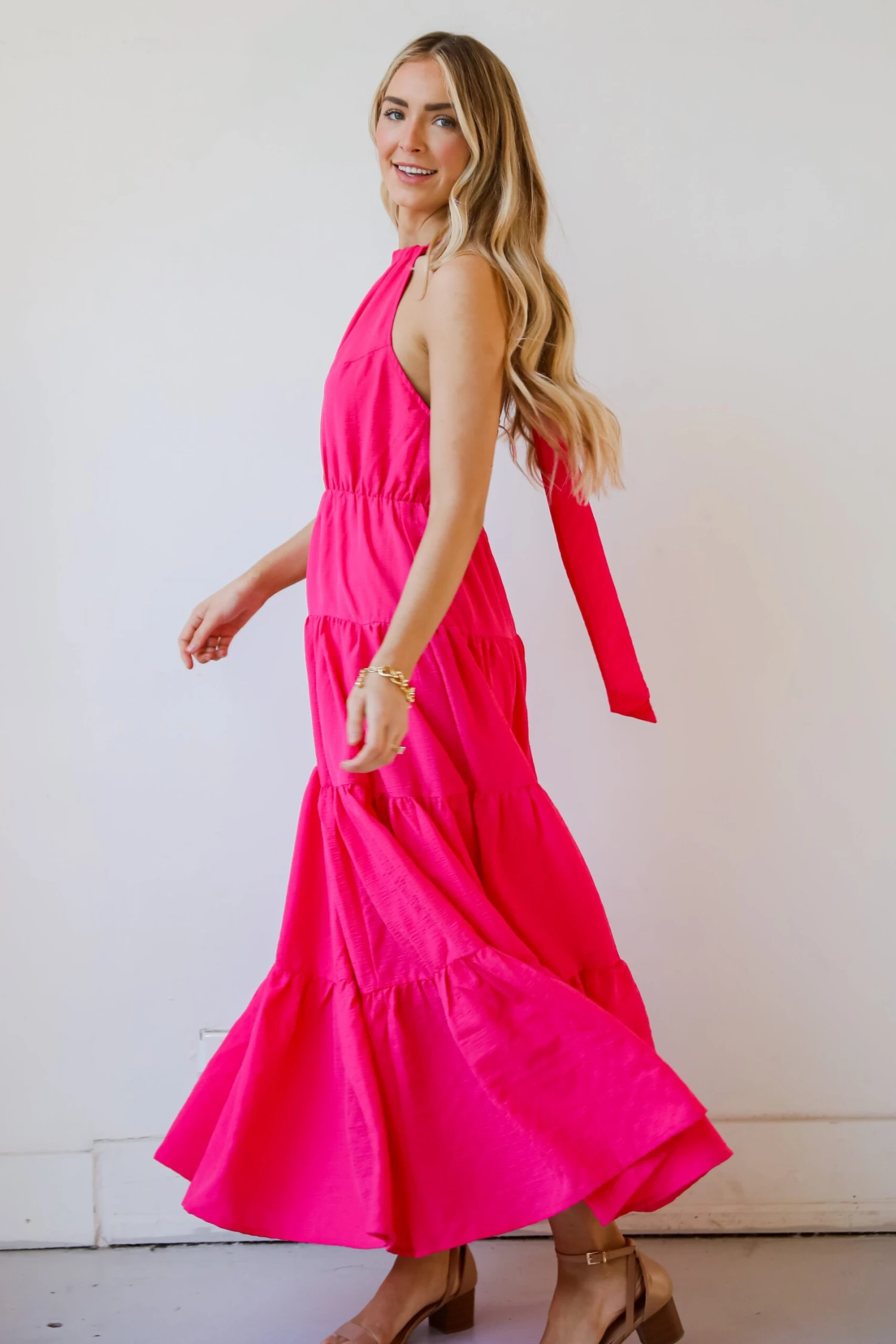 Catch some sun rays in the Sun-Sational Magenta Tiered Halter Maxi Dress! This maxi dress is designed to make a statement, offering a perfect balance between comfort and sophistication for any special occasion. The eye-catching magenta hue takes center stage, infusing your wardrobe with a burst of color that’s both bold and feminine. The tiered design adds an element of playful charm, creating a flowing silhouette that gracefully moves with every step. This dress is a celebration of movement and style, perfect for those moments when you want to make a lasting impression. The halter neckline not only adds a touch of allure but also provides a secure and flattering fit. Whether you’re attending a summer wedding, a garden party, or a romantic evening affair, the halter maxi dress effortlessly exudes grace and sophistication!