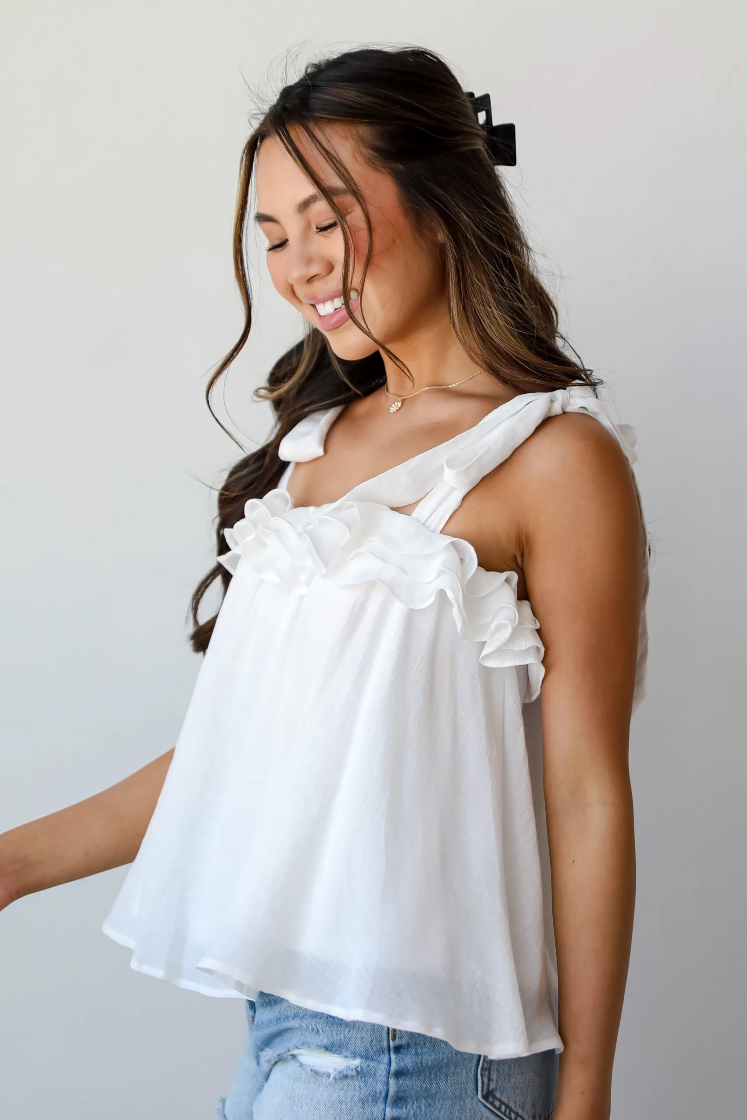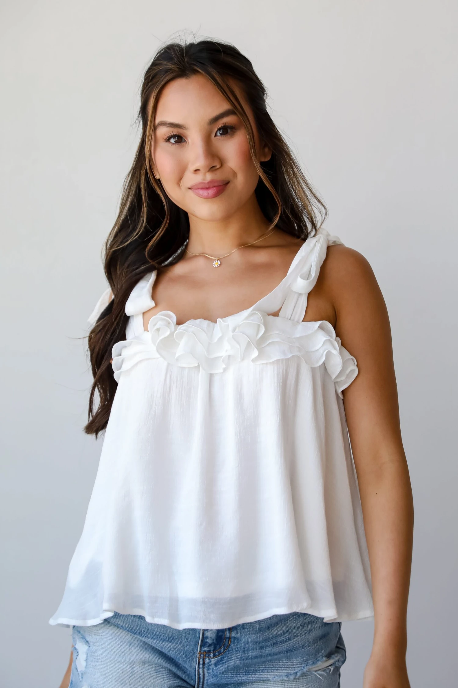 The Sweet Choice Tie Strap Ruffle Tank is always the perfect pick for showing up to any event in the most stylish way! Crafted with meticulous attention to detail, this tank top is designed to elevate your summer wardrobe with its playful charm and versatile style. The tank features delicate ruffle detailing along the neckline and tie straps, adding a touch of whimsy and romance to your ensemble. The tie straps allow for adjustable fit and styling, while the ruffles bring a flirty and feminine vibe to the classic tank silhouette. Whether you’re heading to the beach, running errands, or enjoying brunch with friends, this tank is sure to keep you feeling cool and stylish! Available in 2 colors.