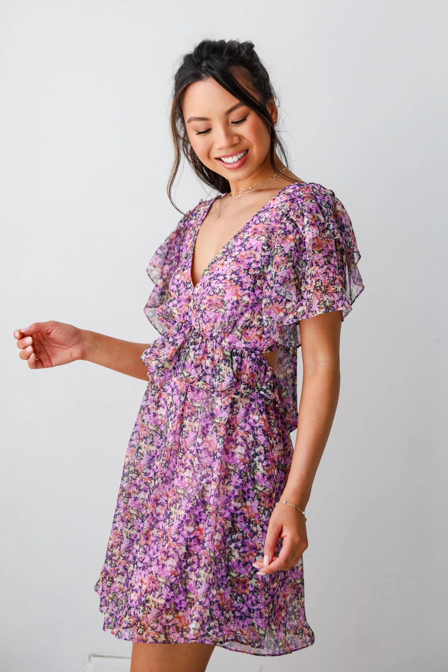 Prepare to make everyone blush with your ultra-charming look in the Sweet Status Purple Floral Mini Dress! Crafted with exquisite attention to detail, this dress exudes a playful elegance that is perfect for any occasion. The rich purple hue of the fabric serves as a captivating backdrop for the delicate floral pattern, which blooms in shades of lavender, lilac, and violet, evoking a sense of romance and enchantment. The ruffle detailing adds a touch of whimsy and movement to the dress, creating a dynamic silhouette that is both flattering and fun. Pair it with strappy sandals and dainty jewelry for a daytime look that exudes effortless charm, or dress it up with heels and statement accessories for an evening affair!