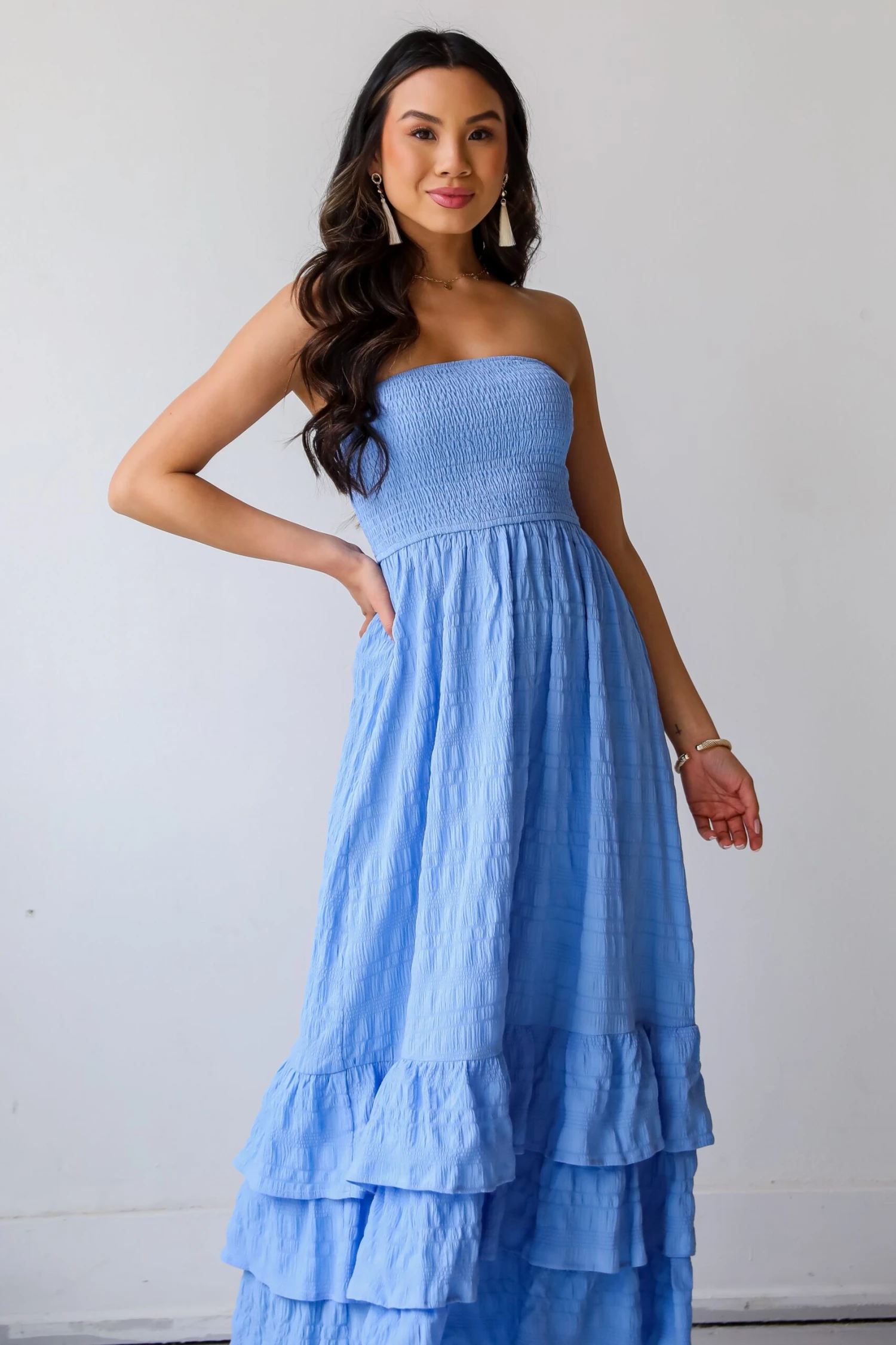 A cutie like you can’t help but get compliments when you wear the Sweetest Presence Blue Smocked Strapless Maxi Dress! This maxi dress is a vision of effortless style, featuring a stunning shade of blue and a smocked, strapless bodice that adds a touch of bohemian charm. Crafted from high-quality fabric, the dress drapes gracefully to a sweeping maxi length, creating a silhouette that is both flattering and comfortable. The smocked bodice not only provides a secure and adjustable fit but also adds a textural element, contributing to the dress’s relaxed and carefree vibe. The strapless design showcases the shoulders and collarbone, offering a subtly alluring touch while keeping you cool during warm days or evenings. The vibrant blue color adds a refreshing and serene quality, making this dress an ideal choice for beach vacations, outdoor events, or casual gatherings!