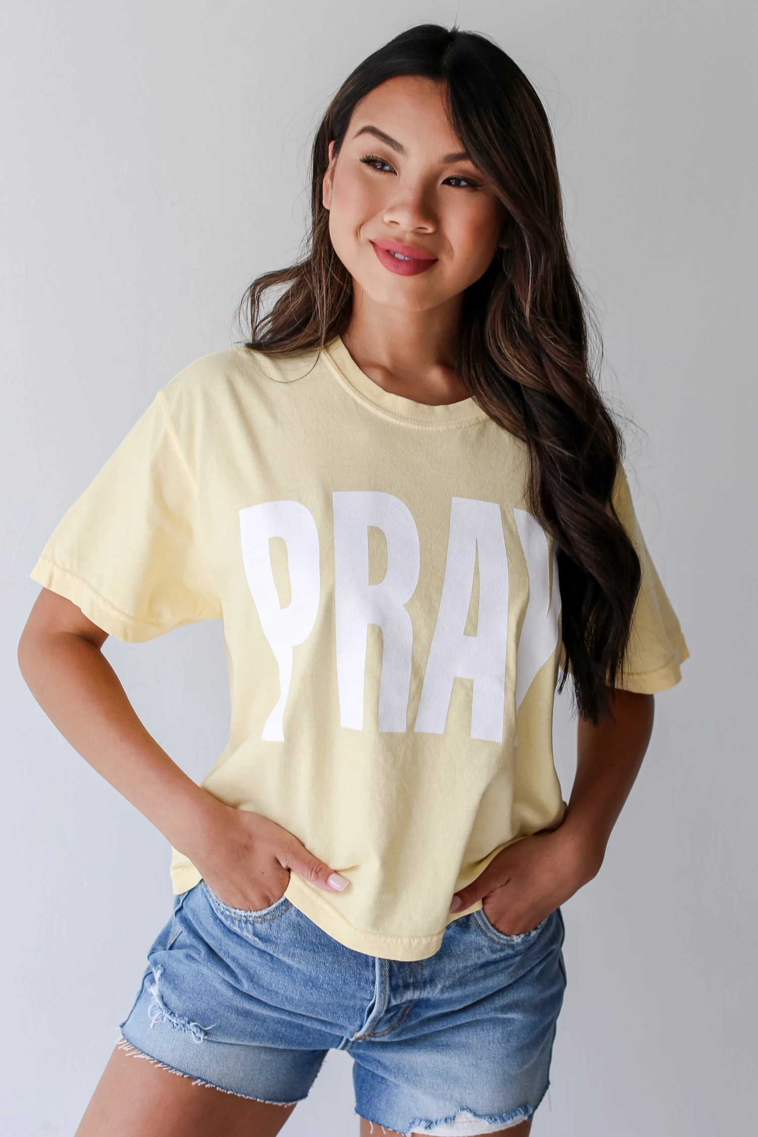 We love the message on the Yellow Pray Cropped Tee! This comfy tee is designed with a soft and stretchy knit. It features a crew neckline, short sleeves, a relaxed fit, and the word “Pray” on the front. Style the Yellow Pray Cropped Tee with your favorite denim and sneakers for a casual daytime look!